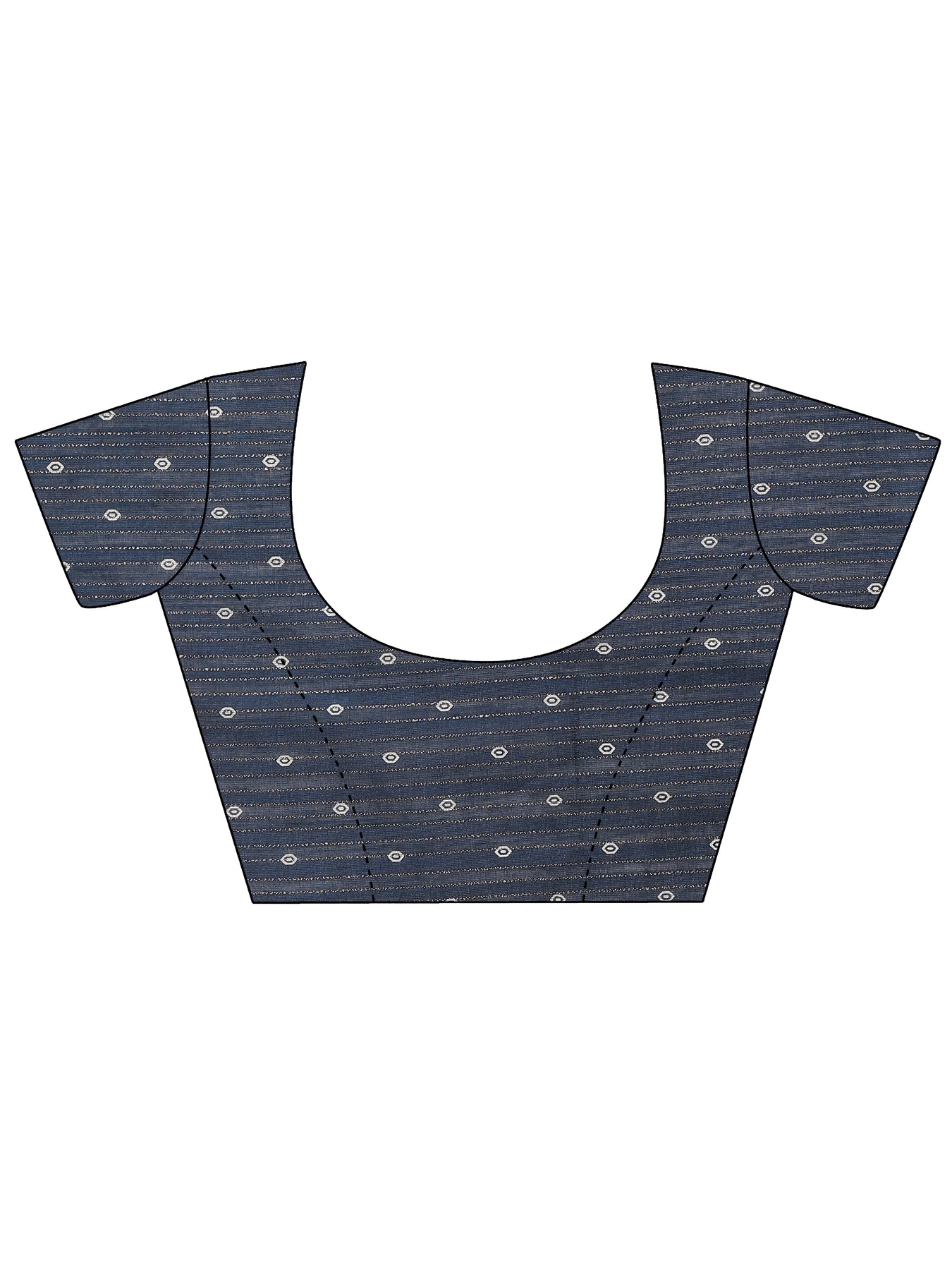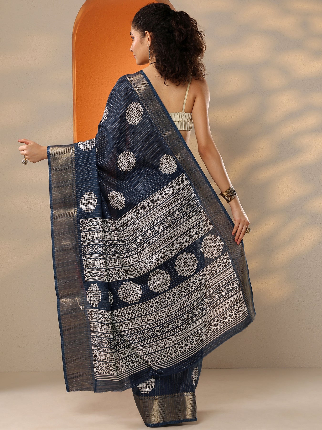 Navy Blue Printed Silk Blend Saree With Unstitched Blouse Piece
