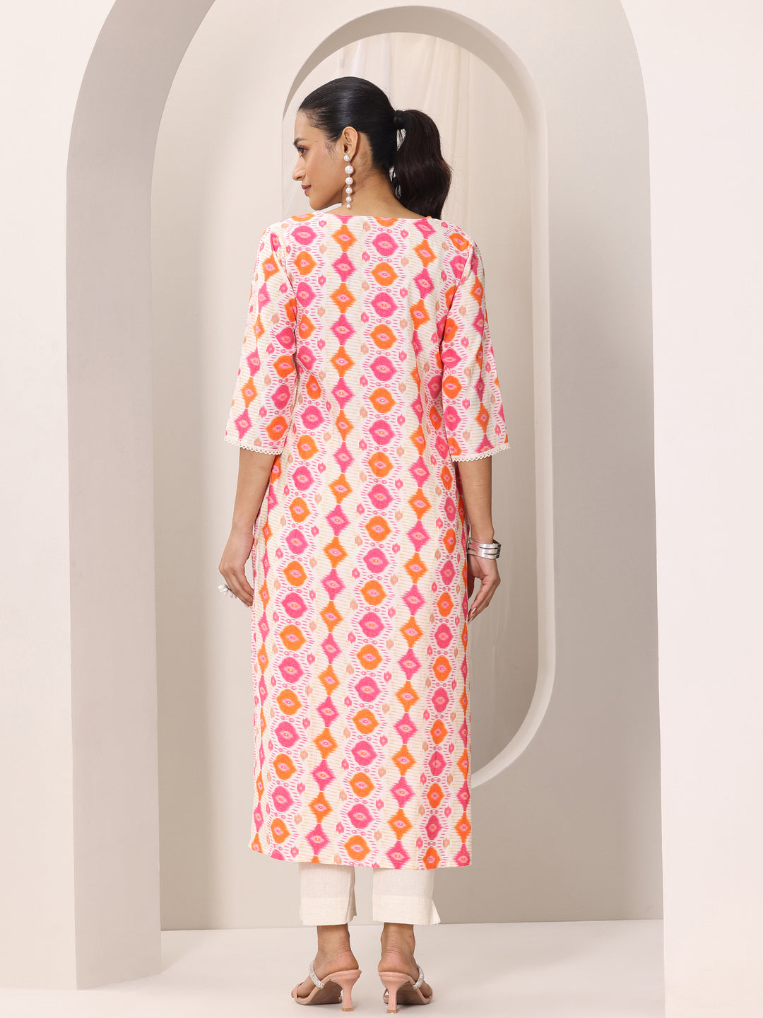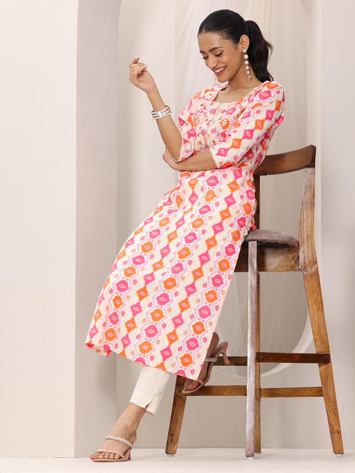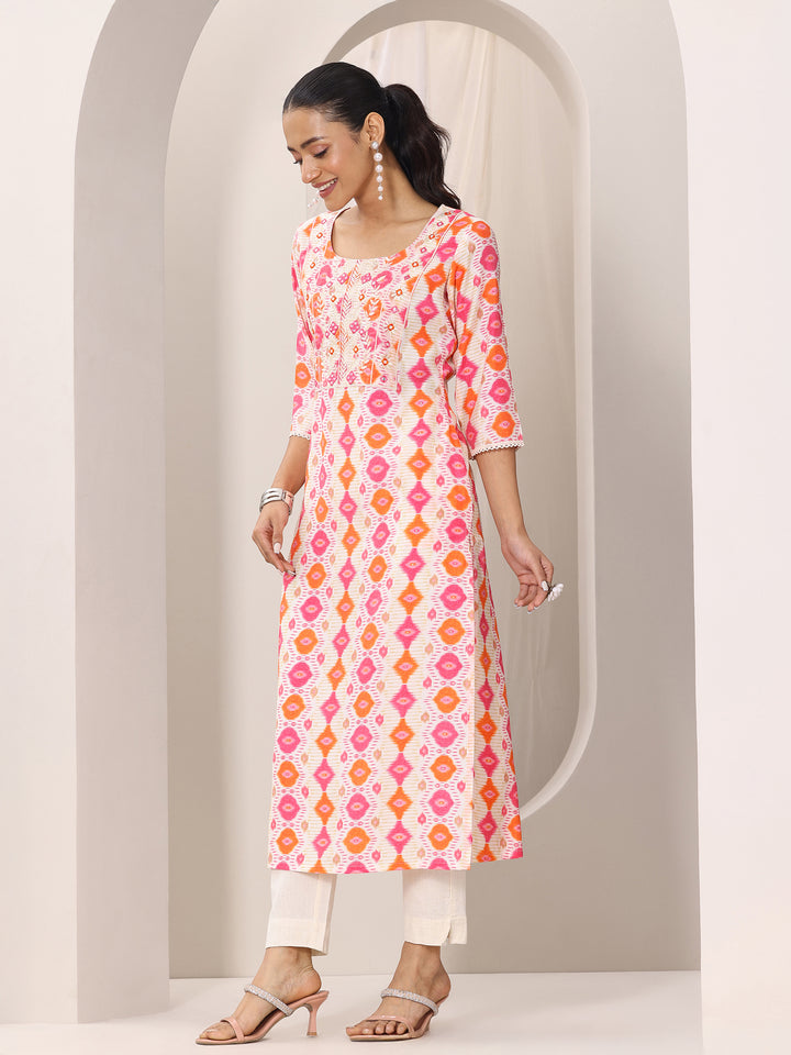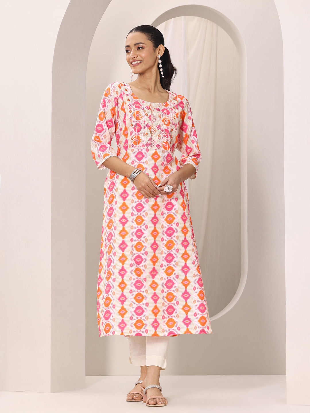 Our orange silk blend straight kurta features a round neckline and three-quarter sleeves. Highlighted with lace-trim accents, mirror work, and roomy pockets, this refreshing style is perfect for light festivities.