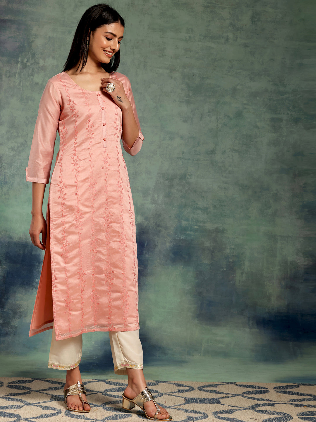 Our peach Chanderi silk straight-fit kurta features a round neckline and three-quarter sleeves. Elevated with floral woven design and handcrafted fabric buttons, this style is perfect for casual outings.