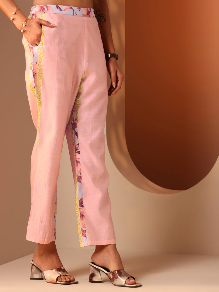 Our 3-piece pink silk blend kurta set features a straight-fit kurta with a mandarin collar, regular sleeves, and statement yoke. Complemented with straight pants with a partially elasticated waistband and 2 pockets, and a floral dupatta. Adorned with floral printed accents, this style is perfect for festive wear.