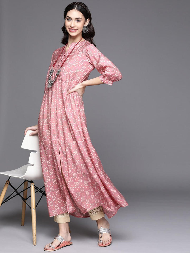 Our pink printed Anarkali kurta, crafted in sumptuous Chanderi silk fabric features a notched neckline with handmade fabric buttons on the yoke, a front-slit, and three-quarter bishop sleeves. Ideal for work and beyond.