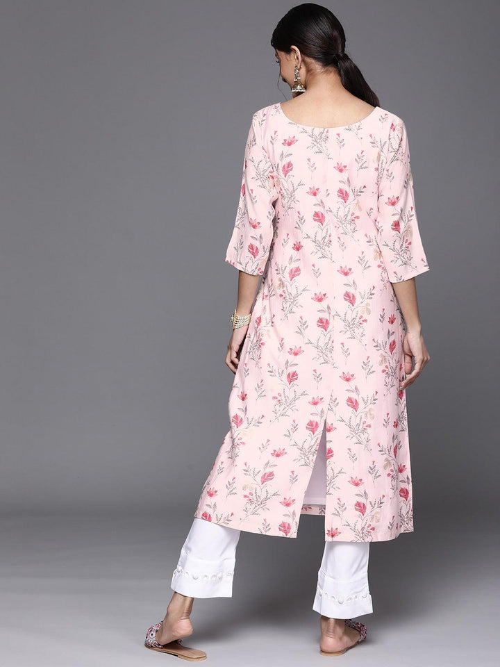 Our pink floral print A-line kurta, crafted in sumptuous Chanderi silk fabric features a boat-neckline, three-quarter sleeves, a back-slit, and roomy pockets. Ideal for a casual outing.