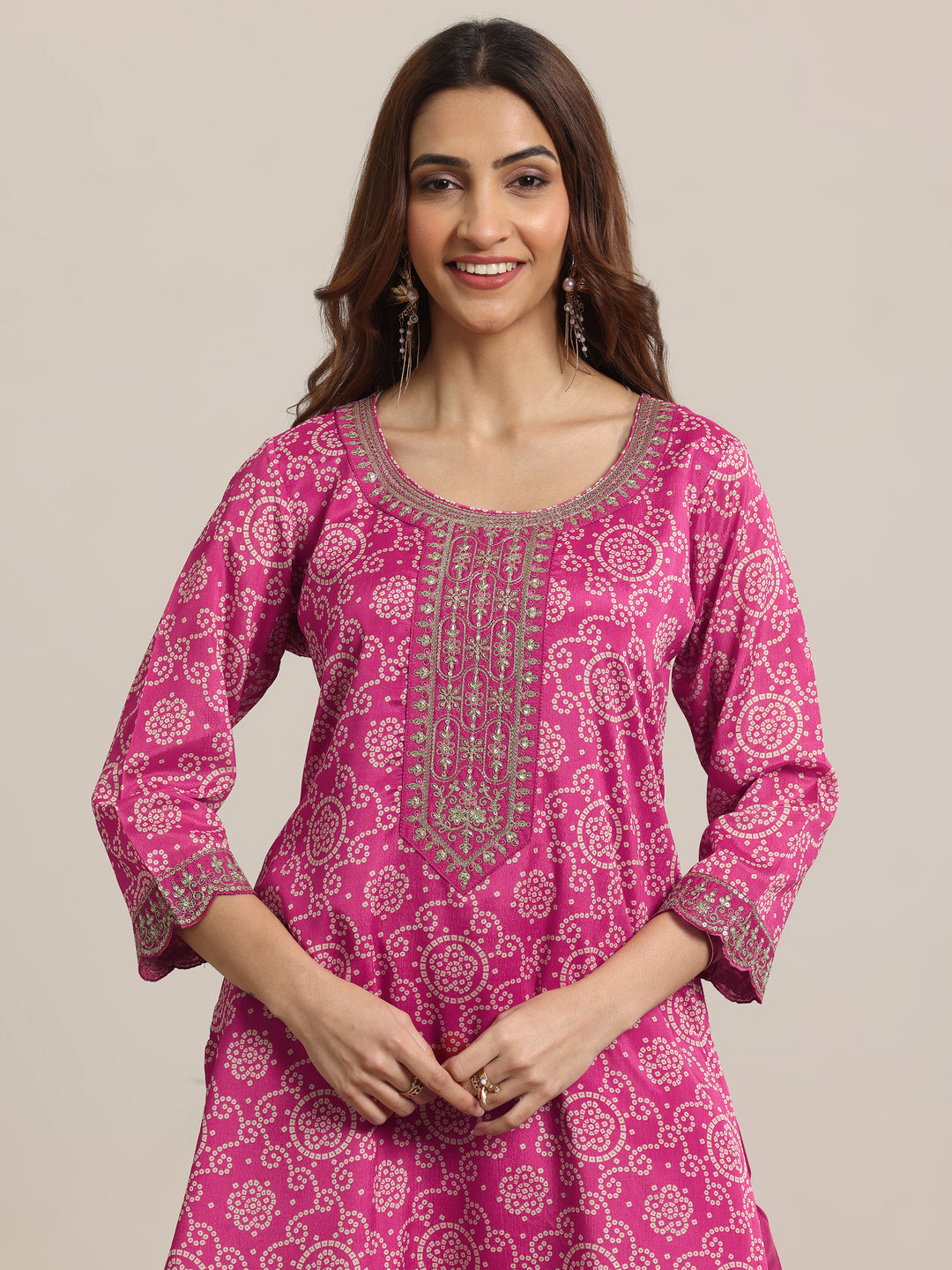 Our 3-piece pink printed chinon straight suit set features a kurta with a round neckline, three-quarter sleeves, and a statement yoke. Complemented with trousers with a fully elasticated waistband and roomy pockets, and a dupatta. Highlighted with intricate thread work, sequins, and Bandhani-inspired prints, this style is perfect for festive celebrations.