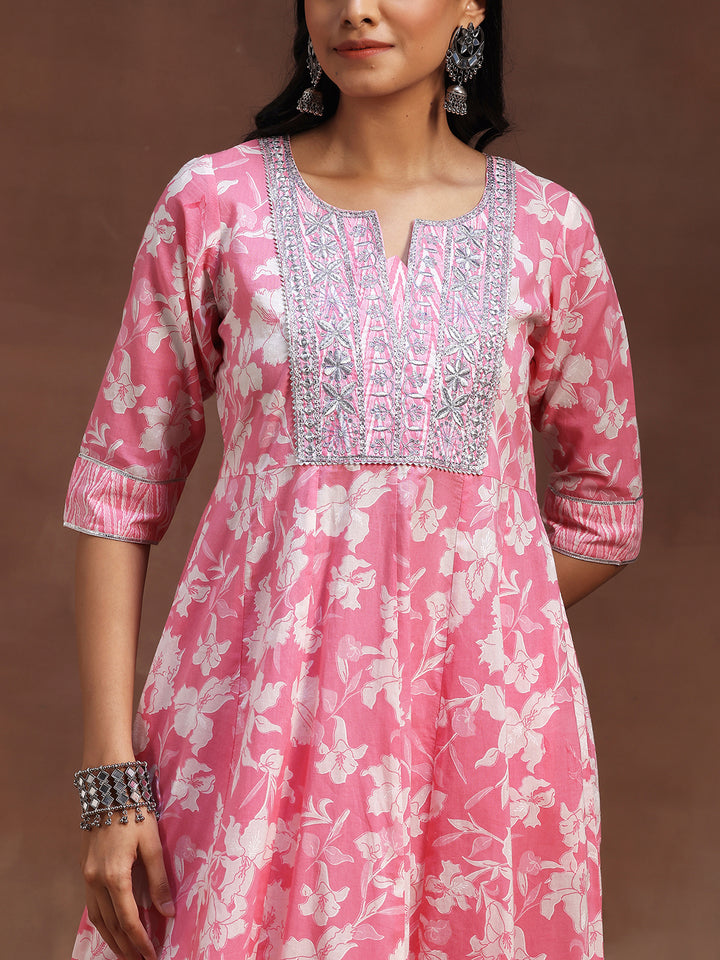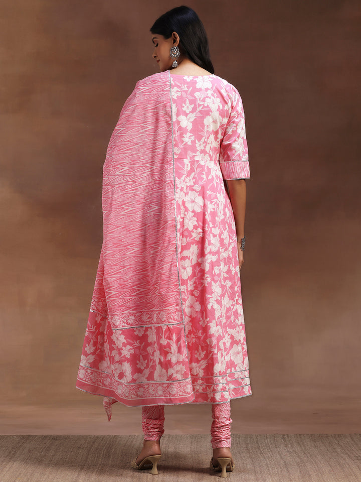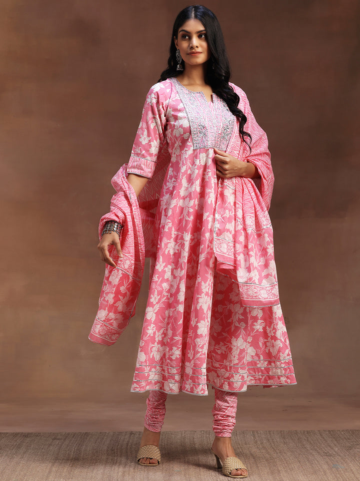 Pink Printed Cotton Anarkali Suit With Dupatta