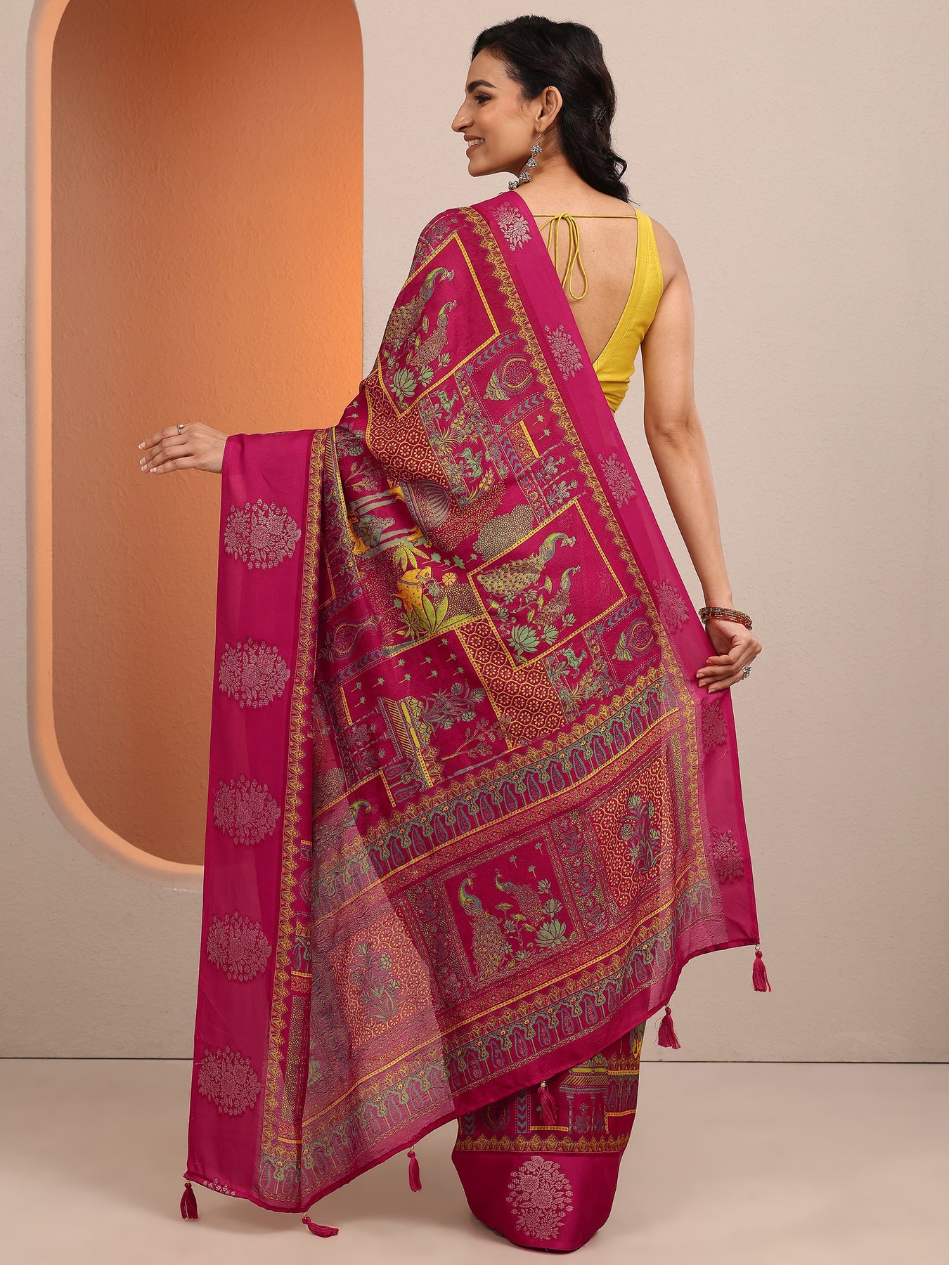 Pink Printed Silk Blend Saree With Unstitched Blouse Piece