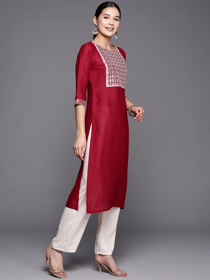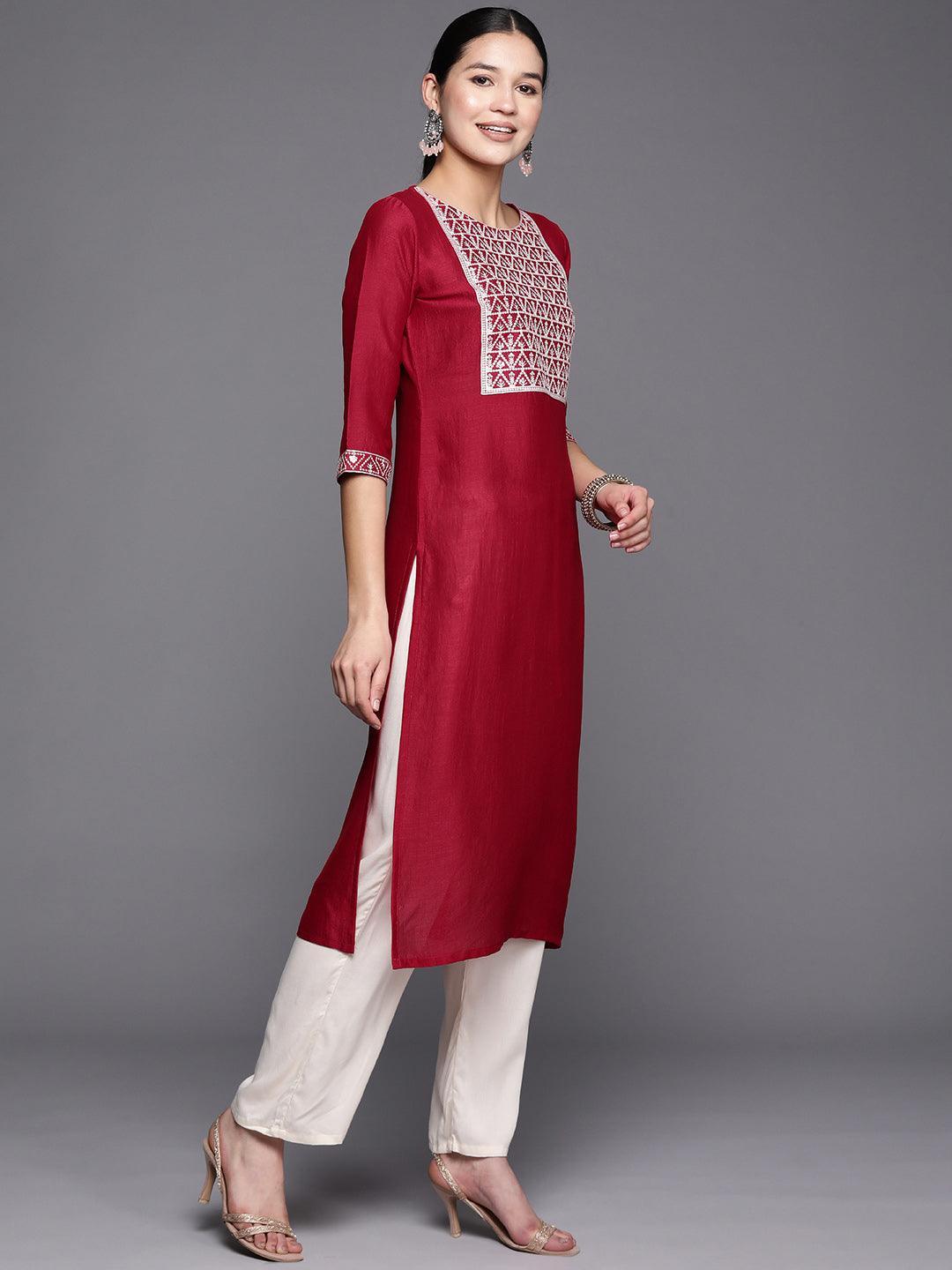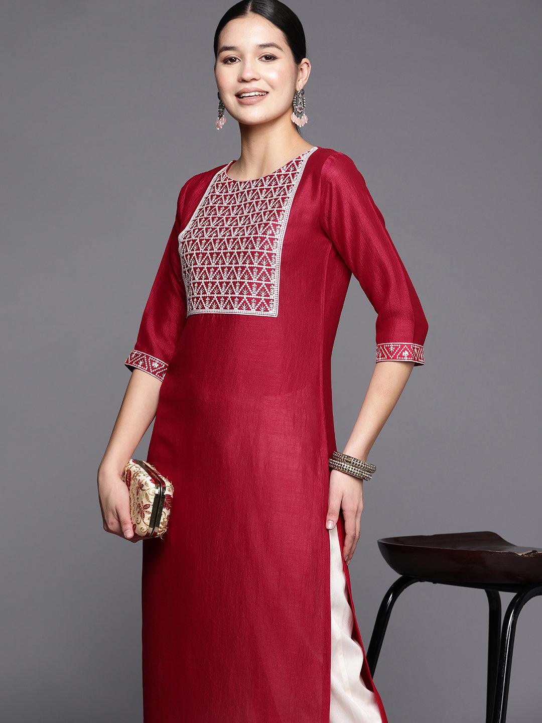 Our pink solid tone straight-fit silk kurta features a round neckline, three-quarter sleeves, and a statement yoke. Elevated with intricate embroidery, this graceful style is perfect for light festivities.