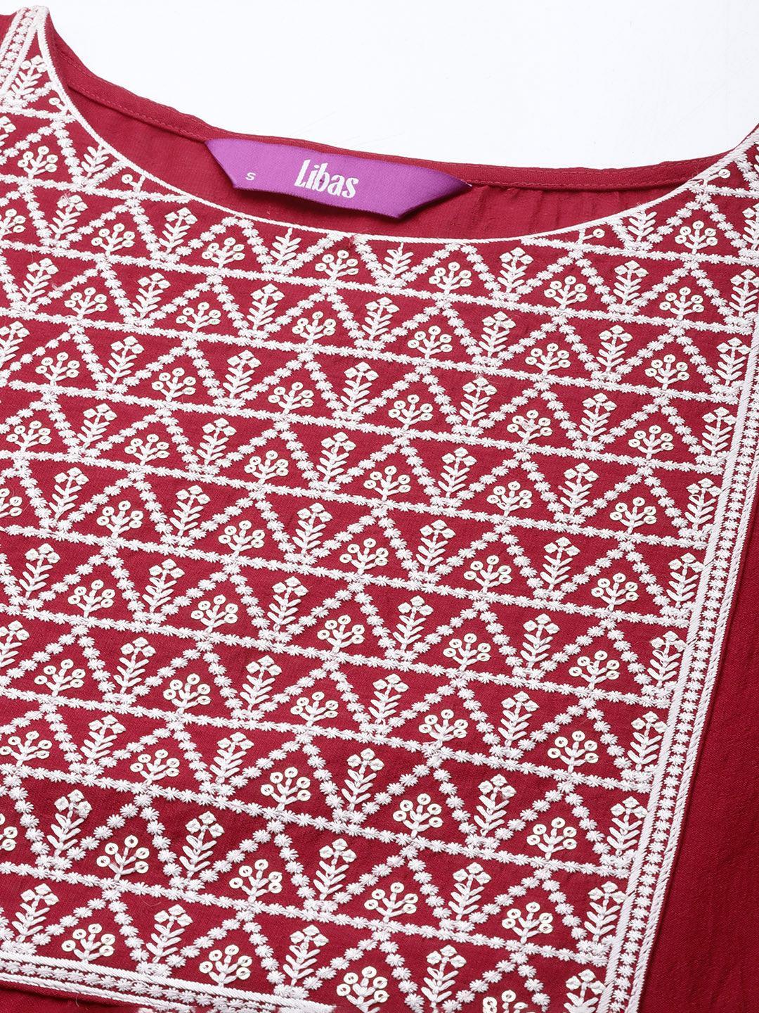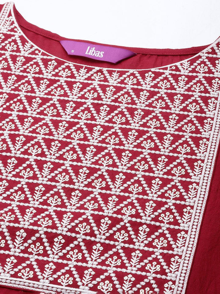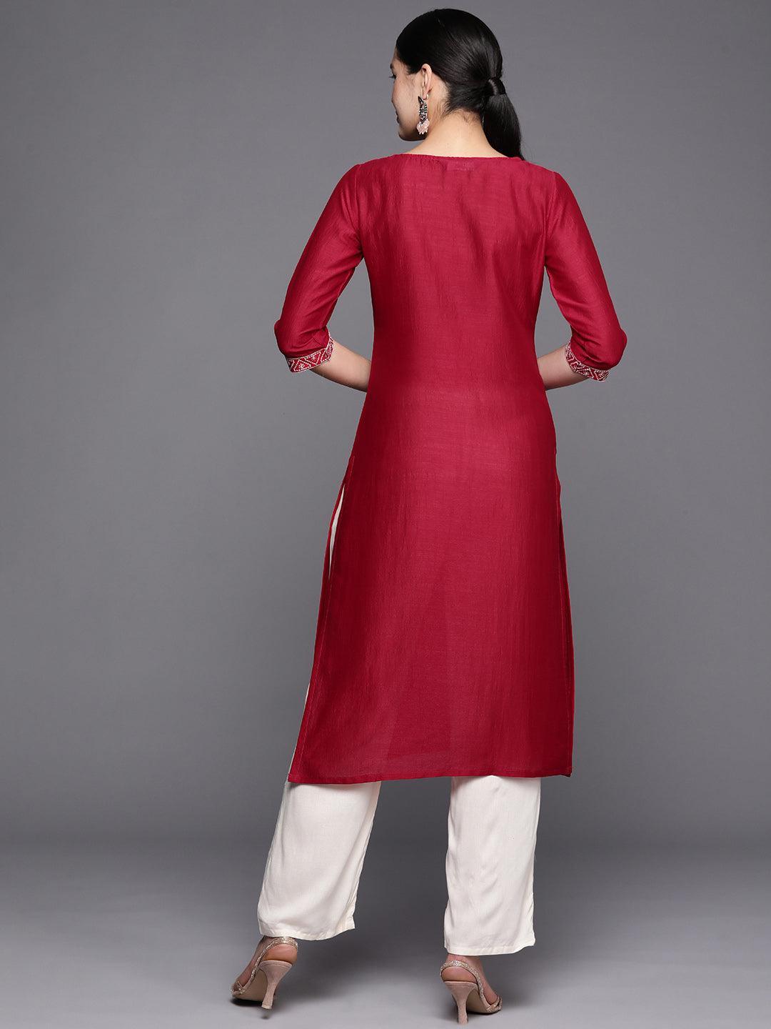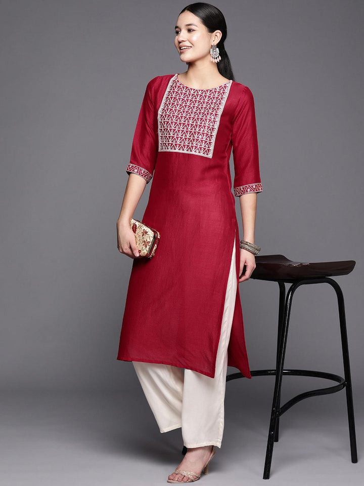 Our pink solid tone straight-fit silk kurta features a round neckline, three-quarter sleeves, and a statement yoke. Elevated with intricate embroidery, this graceful style is perfect for light festivities.