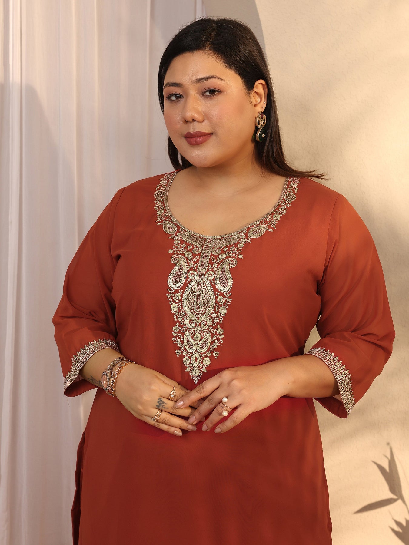 Plus Size Orange Embroidered Georgette Straight Suit Set With Dupatta