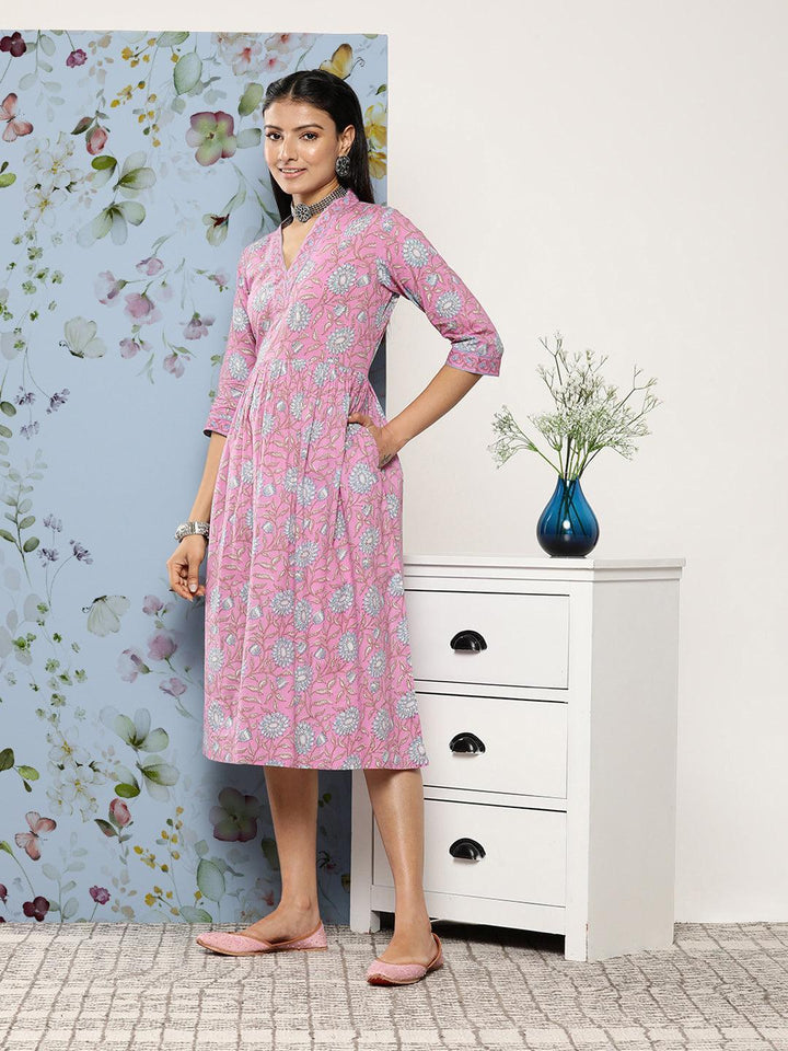 Our lavender purple floral print fit and flare cotton midi dress features a classic v-neckline, three-quarter sleeves, roomy pockets, and a flared hemline. Adorned with delicate fabric-trim accents, this comfortable style is perfect for elevated everyday wear.