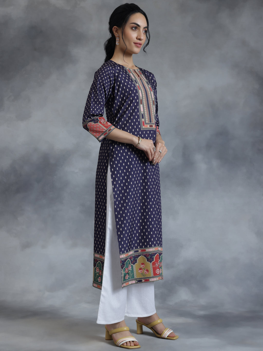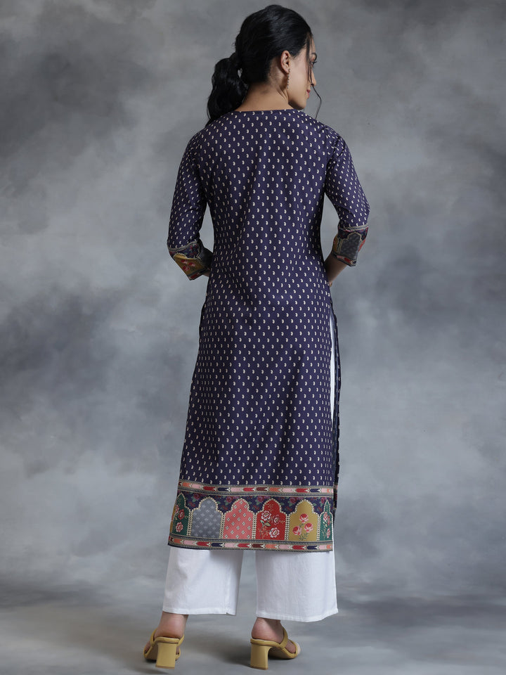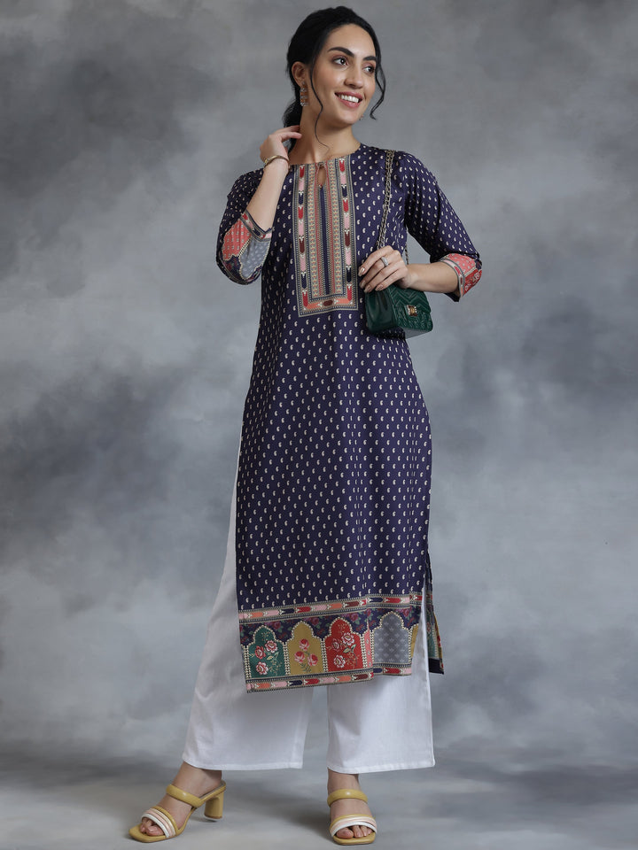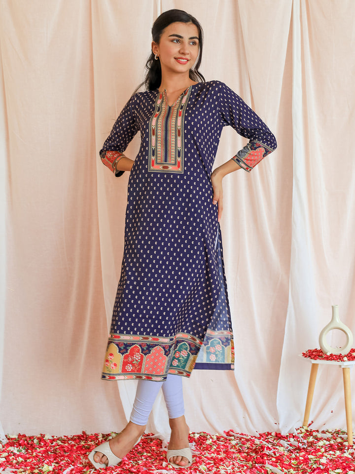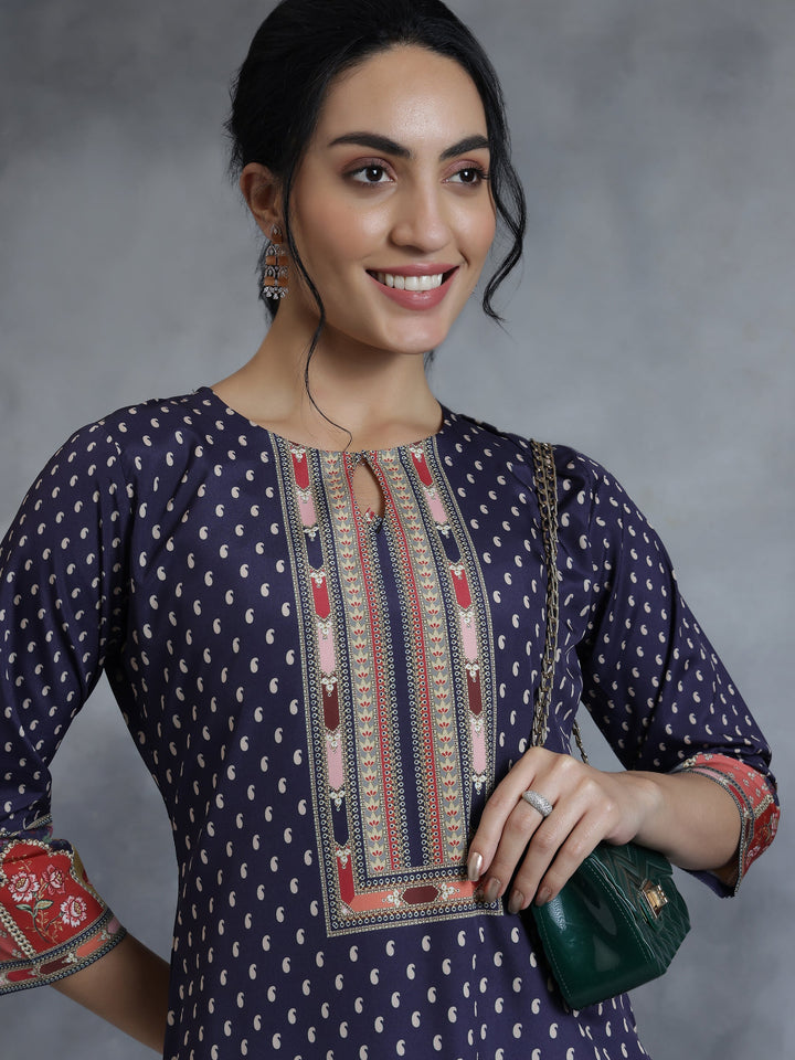 Our purple printed crepe kurta features a straight silhouette, a keyhole neckline, and three-quarter sleeves. Elevated with paisley prints, this style is perfect for elevated everyday wear.