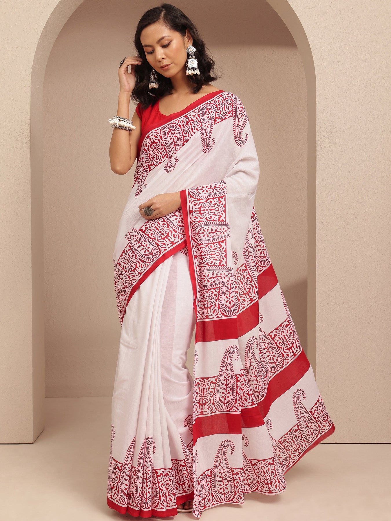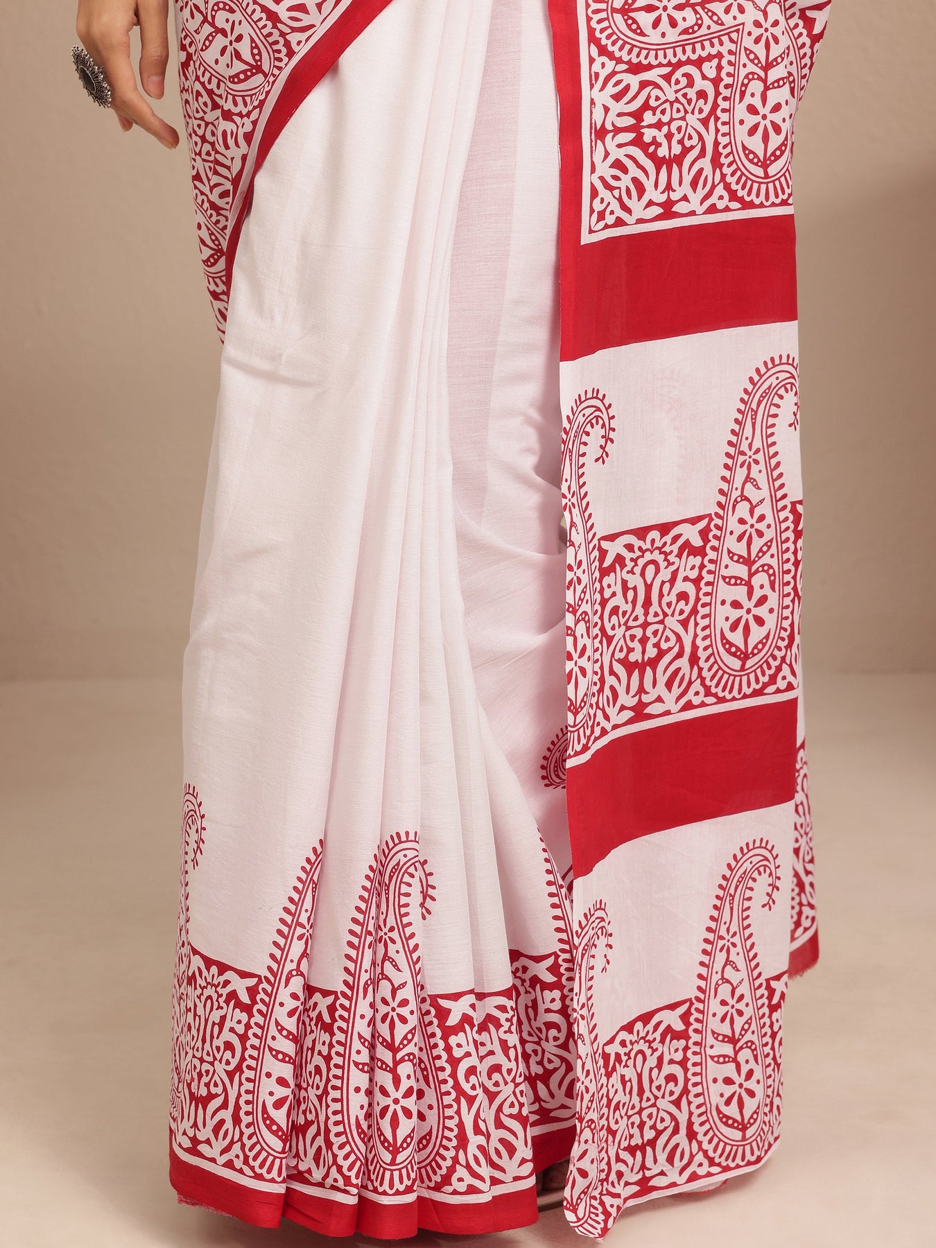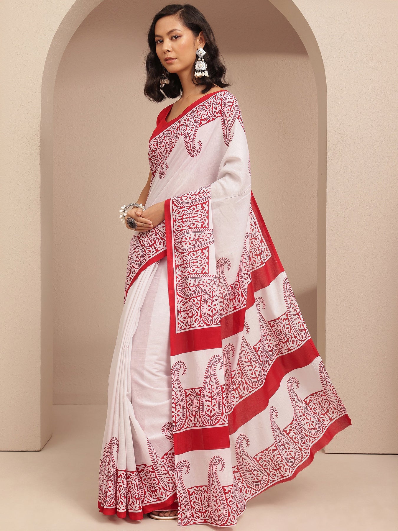 Red Paisley Printed Cotton Saree With Unstitched Blouse Piece