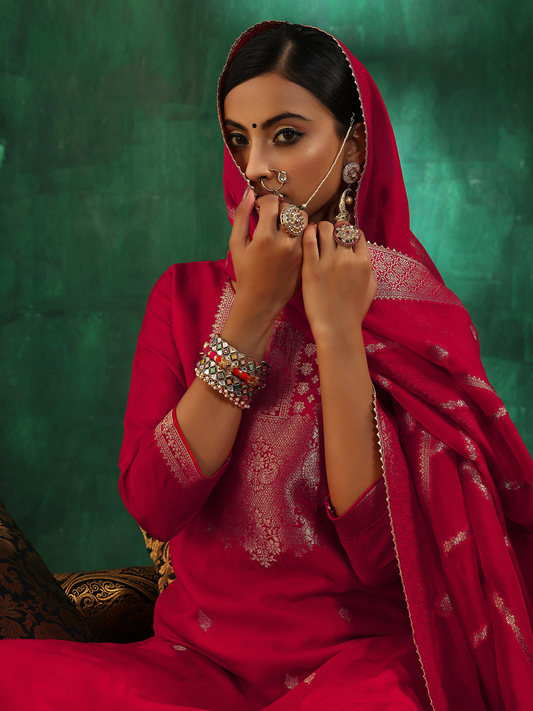 Red Woven Design Silk Blend Straight Suit With Dupatta