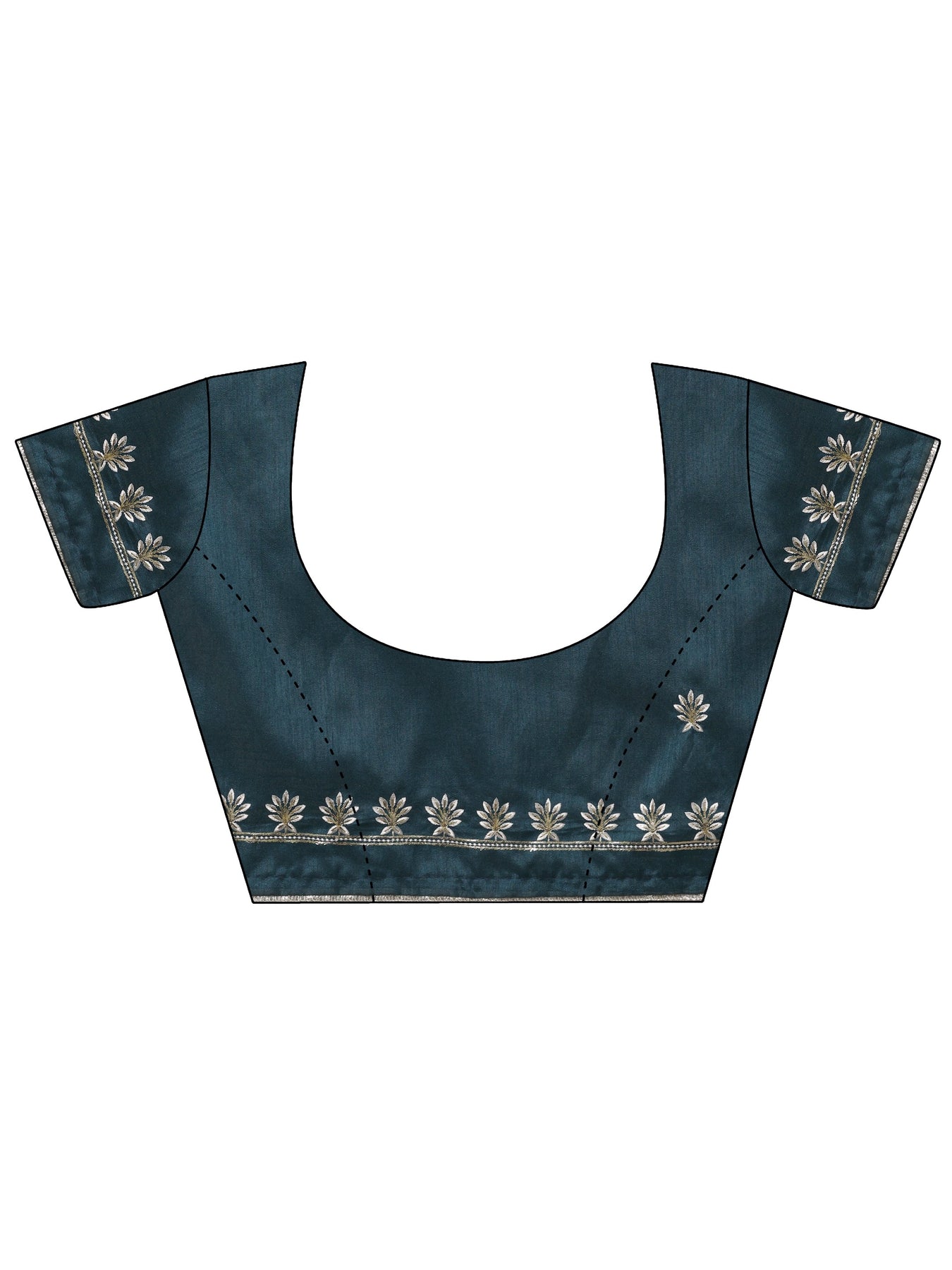 Our Teal Organza Saree Features Captivating Floral Embellishments. Complemented With An Unstitched Blouse Piece. This Charming Saree Is Perfect For Festive Occasions