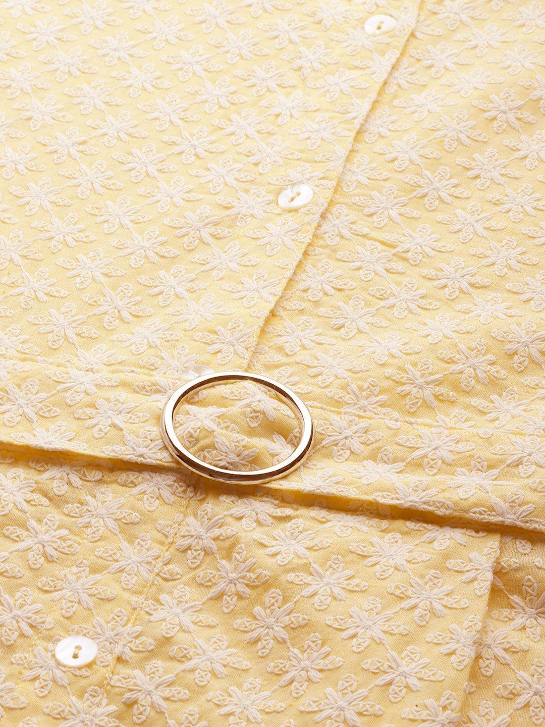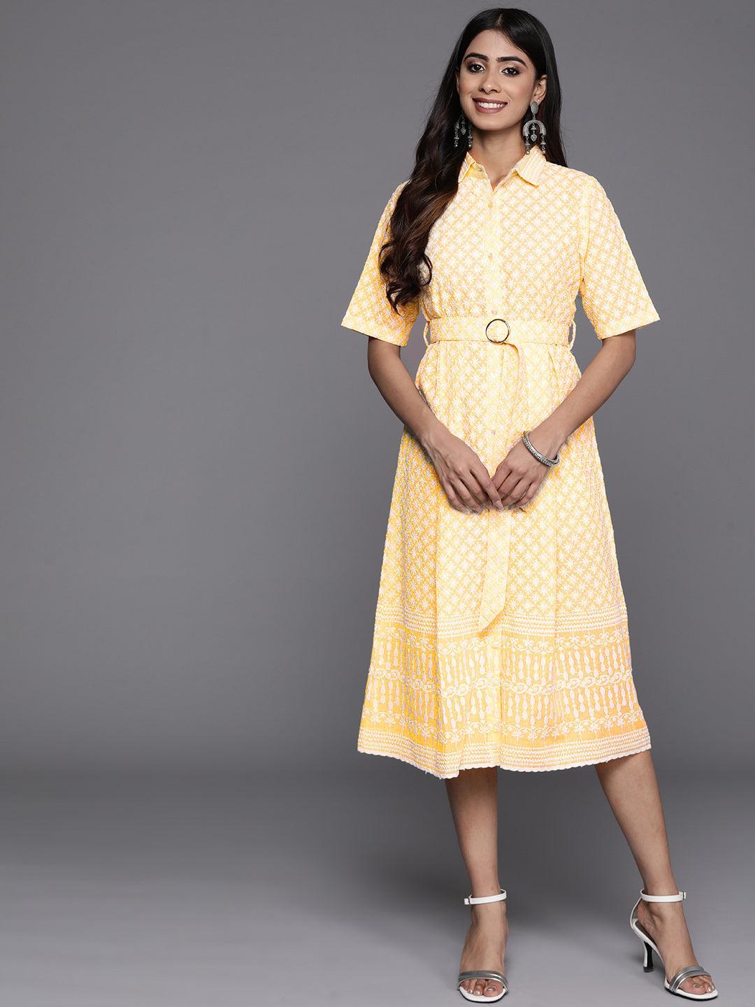 Our yellow embroidered buttoned-down shirt dress, crafted in comfortable cotton fabric, features a collared neckline, half sleeves, and a flared hemline. Adorned with elaborate embroidery, stylish buttons, and a fabric belt with stylish metal buckle, this style is ideal for casual outings.
