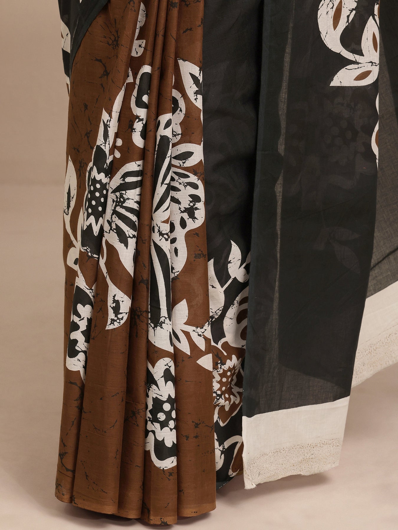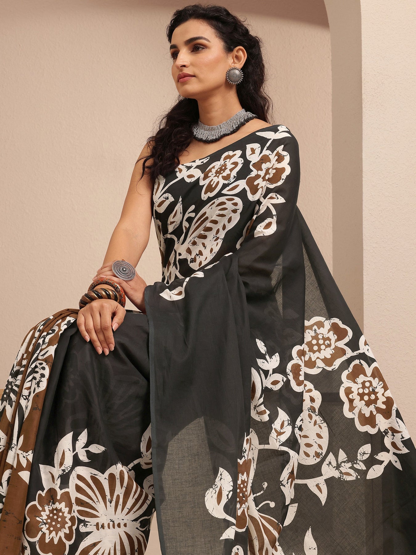 Black Printed Cotton Saree With Unstitched Blouse Piece