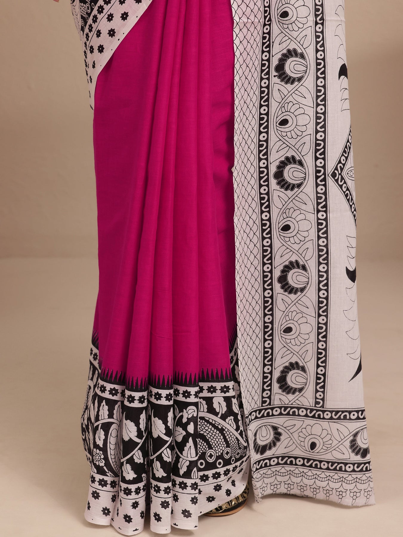 Our pink printed cotton saree features captivating top print. Complemented with an unstitched Blouse Piece. This charming saree is perfect for festive occasions