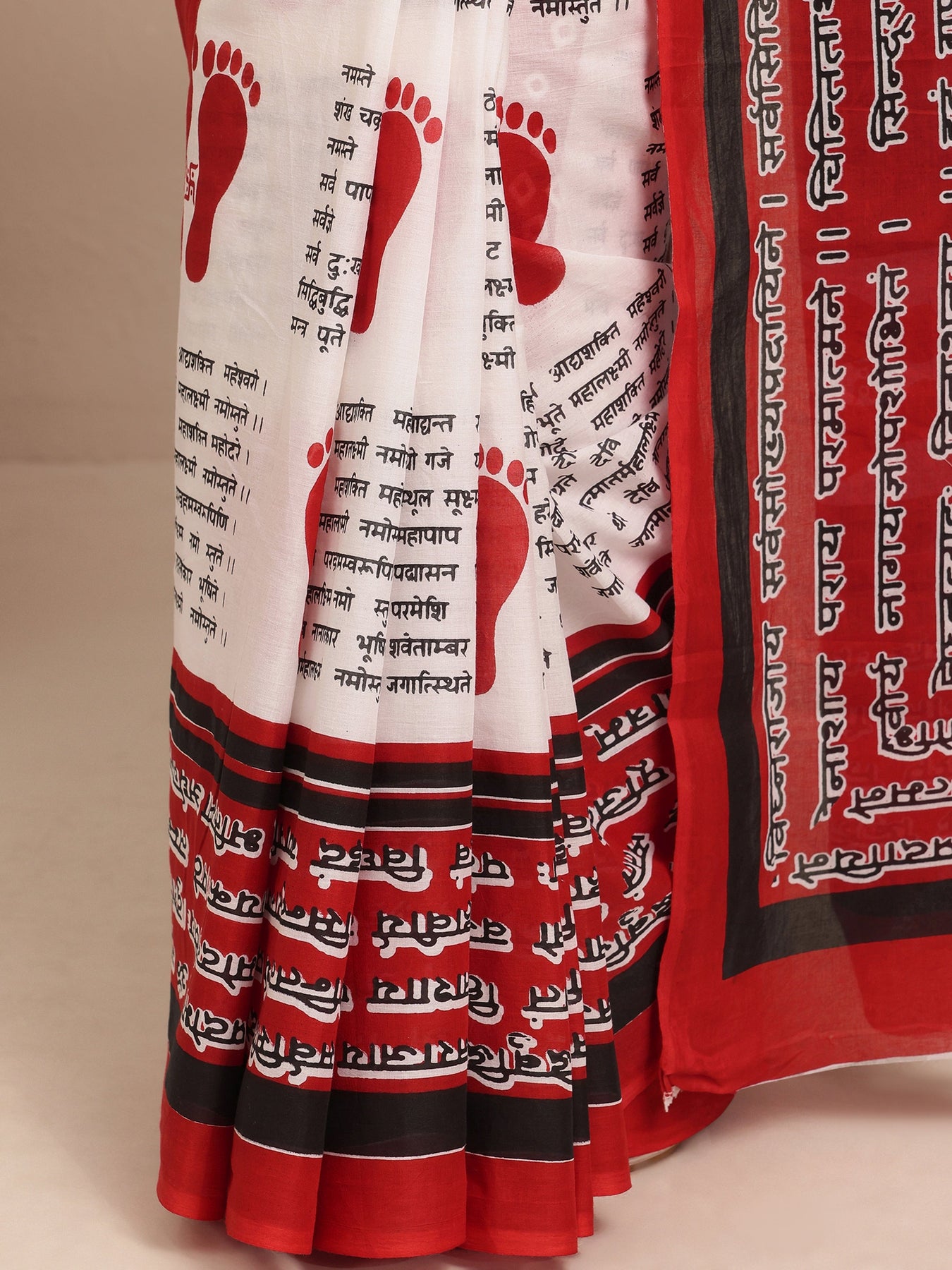 Our red printed cotton saree features captivating traditional script and motif print. Complemented with an unstitched Blouse Piece. This charming saree is perfect for festive occasions