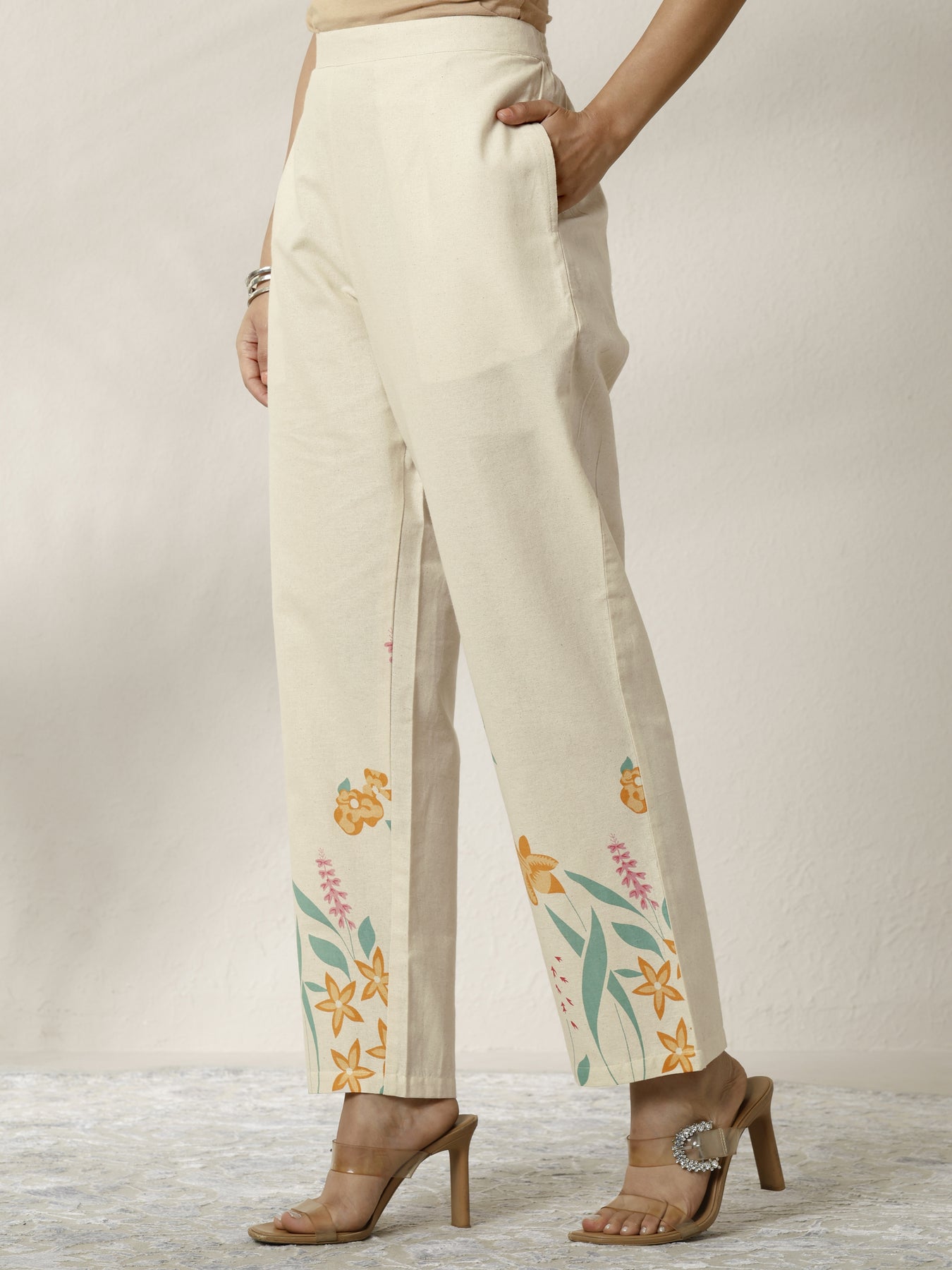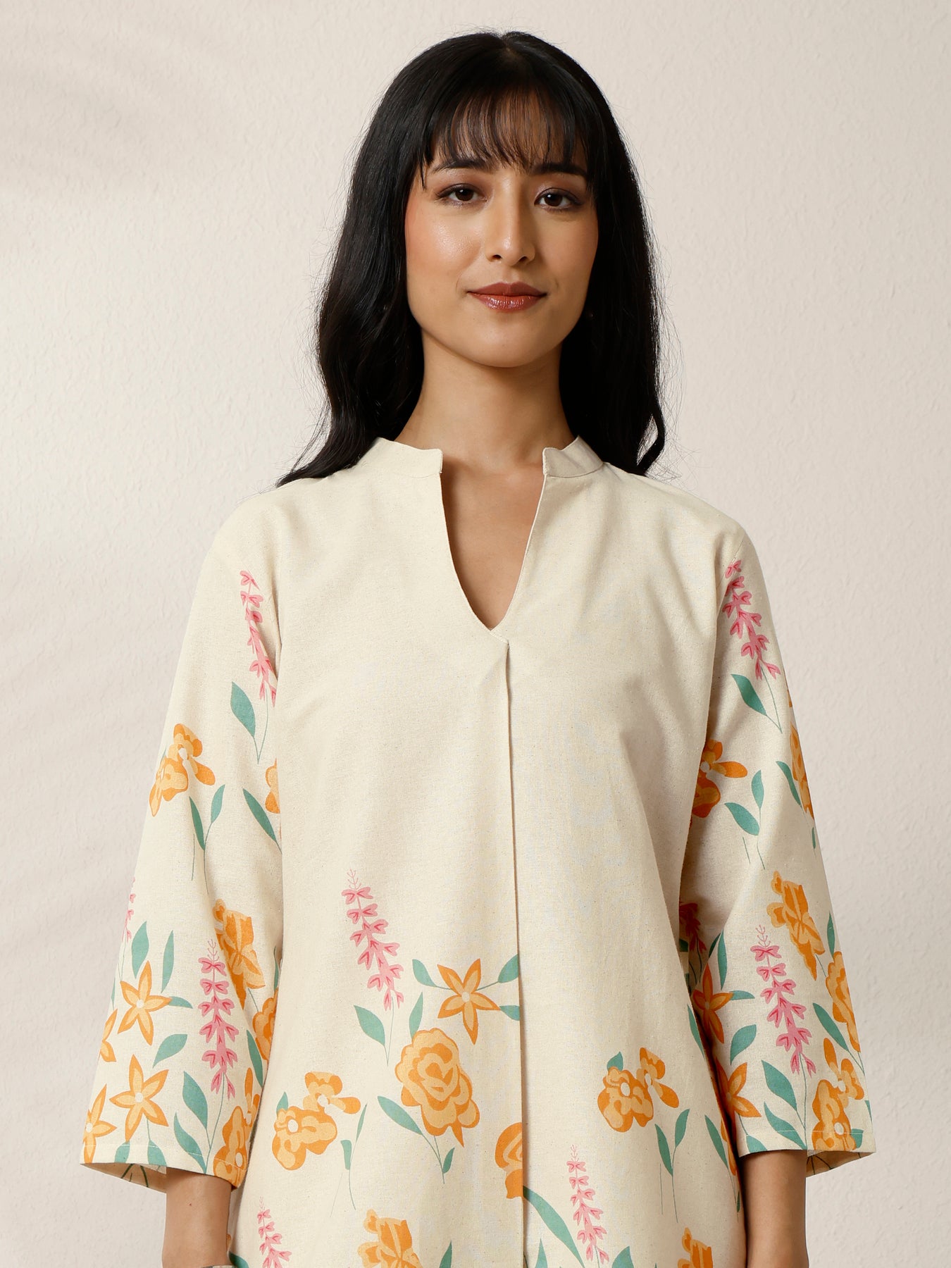 Our 2-piece off white printed cotton blend co-ord set features a Straight-fit Tunic with a V-Neck neckline and Three-quarter sleeves. Complemented with matching Trousers with a Partially Elasticated waistband and 2 pockets. Highlighted with Top Print, this style is perfect for Work Wear and Casual Wear.