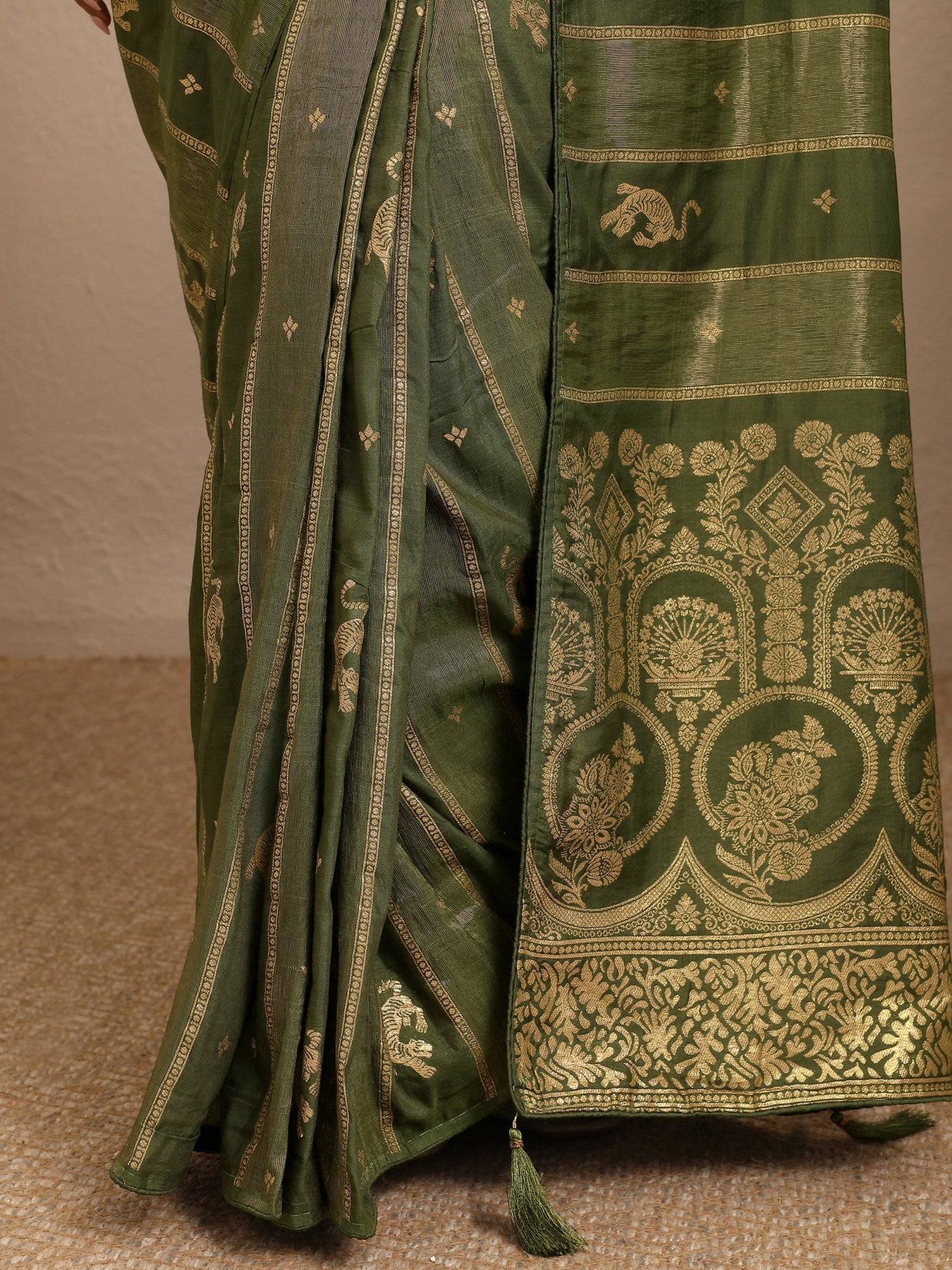 Our olive printed silk blend saree features captivating traditional motifs. Complemented with a blouse piece. This charming saree is perfect for festive occasions.