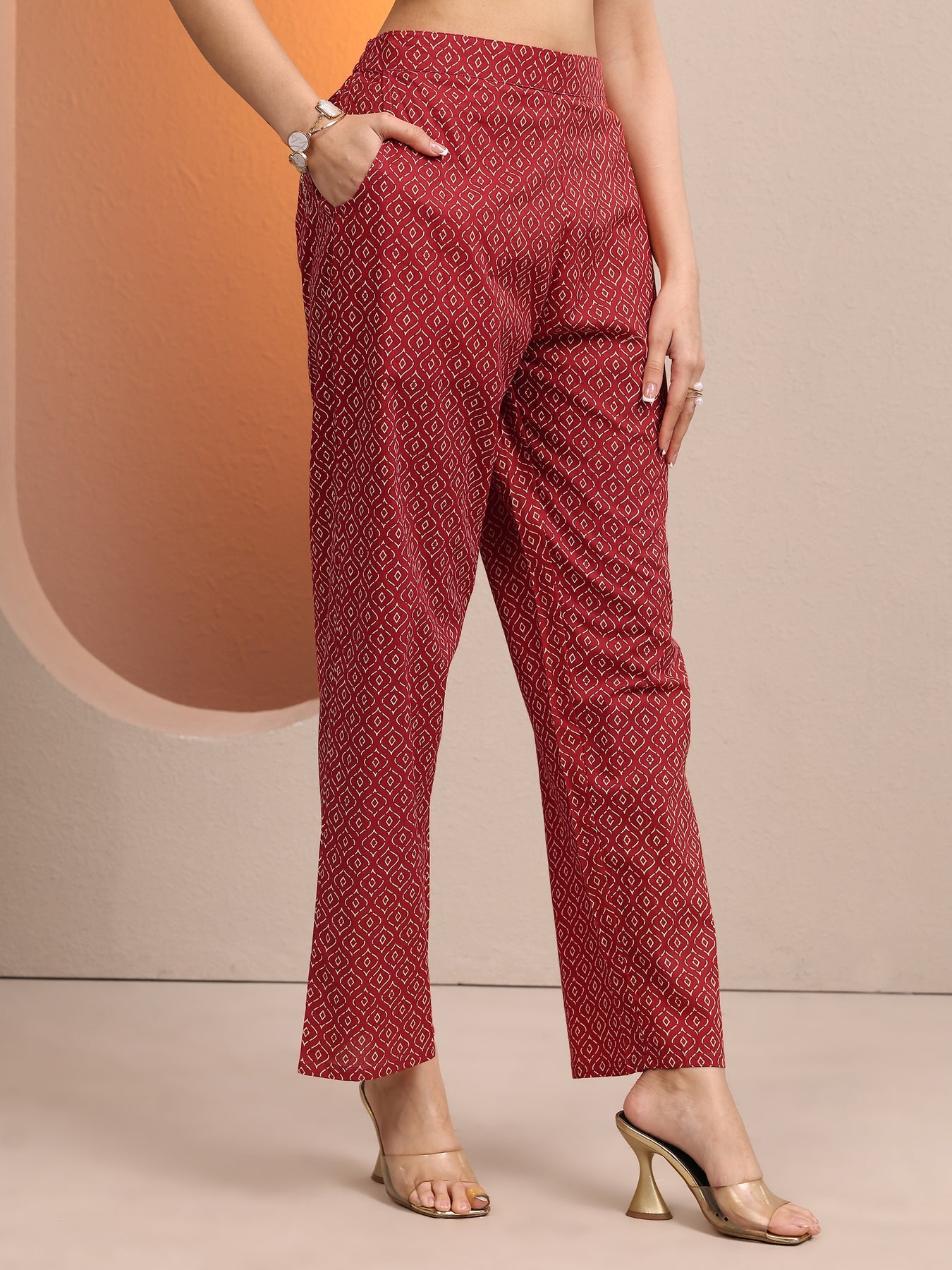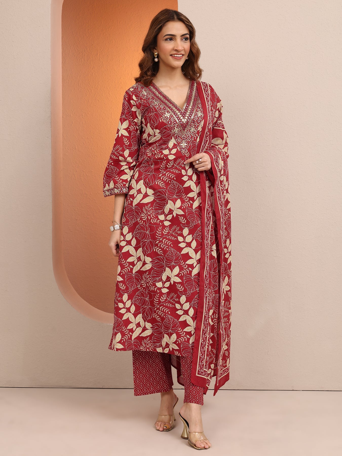 Our 3-piece red cotton straight-fit kurta set features a V-neckline, regular sleeves, and statement yoke. Complemented with straight pants with a partially elasticated waistband and 2 pockets, and a floral dupatta. Adorned with floral printed, this style is perfect for dark festive occasions.