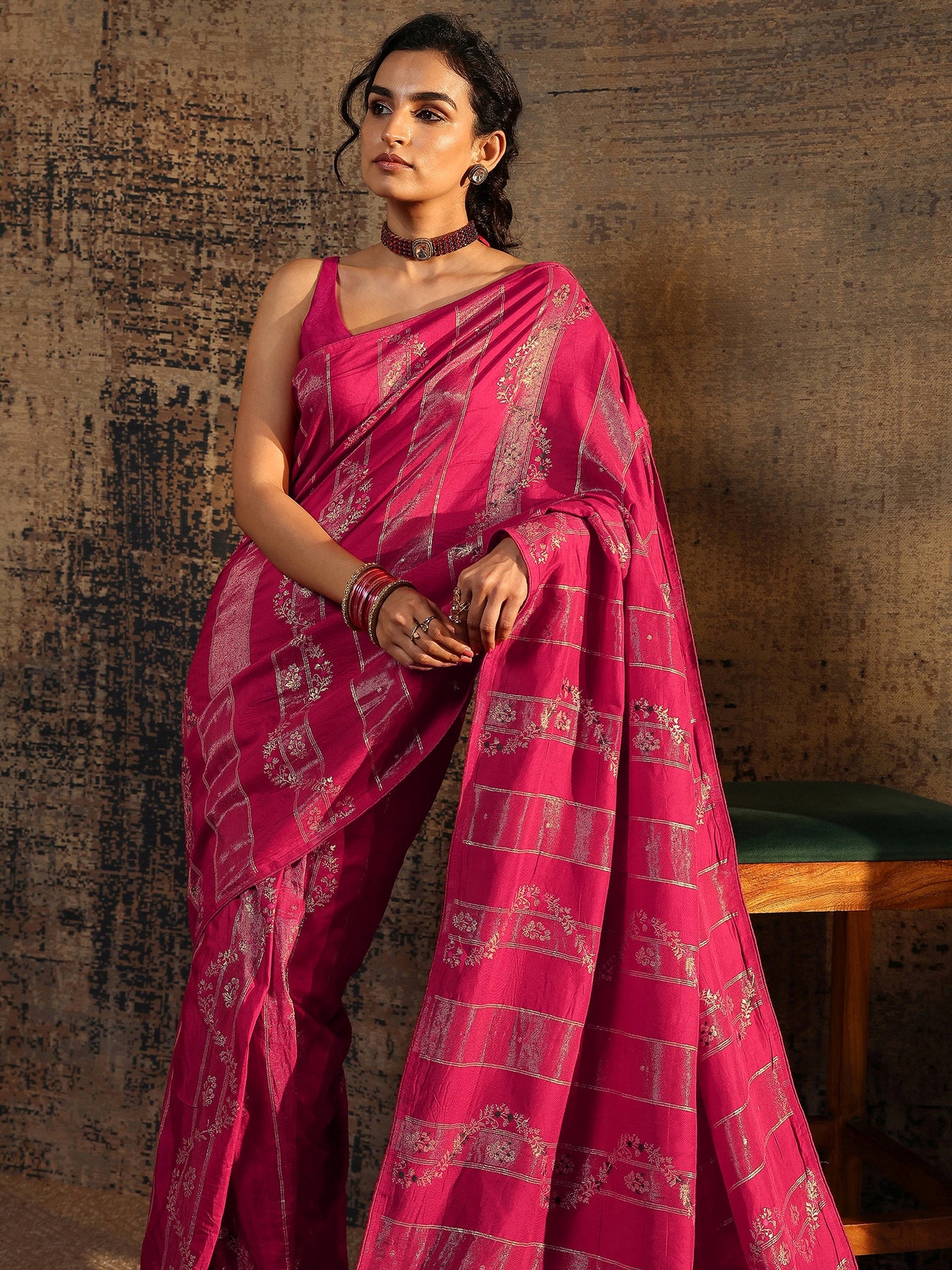 Our pink printed silk blend saree features captivating floral print. Complemented with an unstitched Blouse Piece. This charming saree is perfect for festive occasions