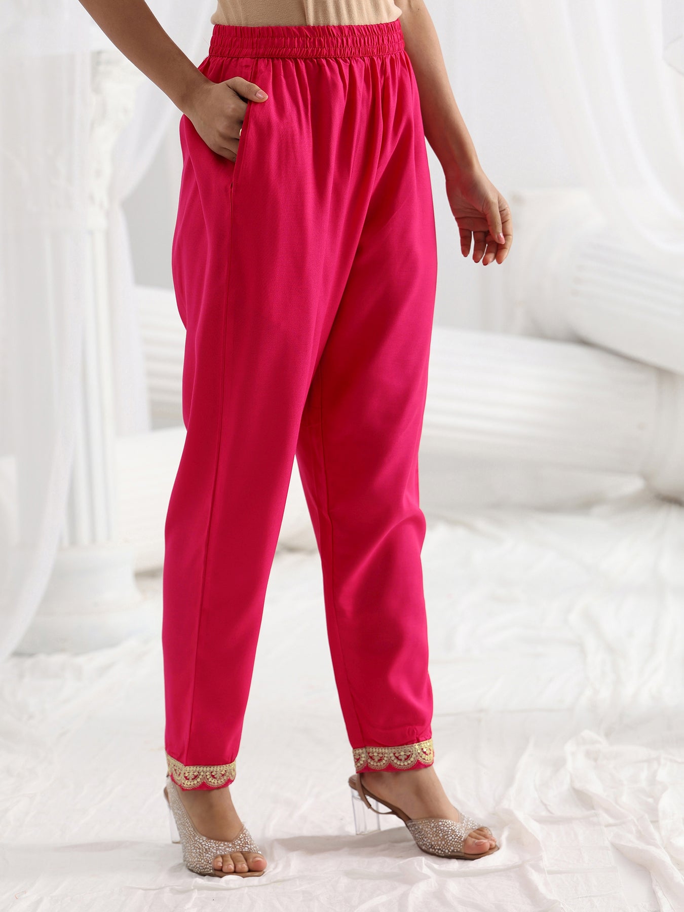 Our 3-piece Orange and Pink Chinon Straight-Fit Kurta Set features a Round Neckline, Regular Sleeves, and statement Yoke. Complemented with Straight Pants with a Partially Elasticated waistband and 2 pockets, and an Embroidered dupatta. Adorned with bandhani printed, this style is perfect for Festive occasions.