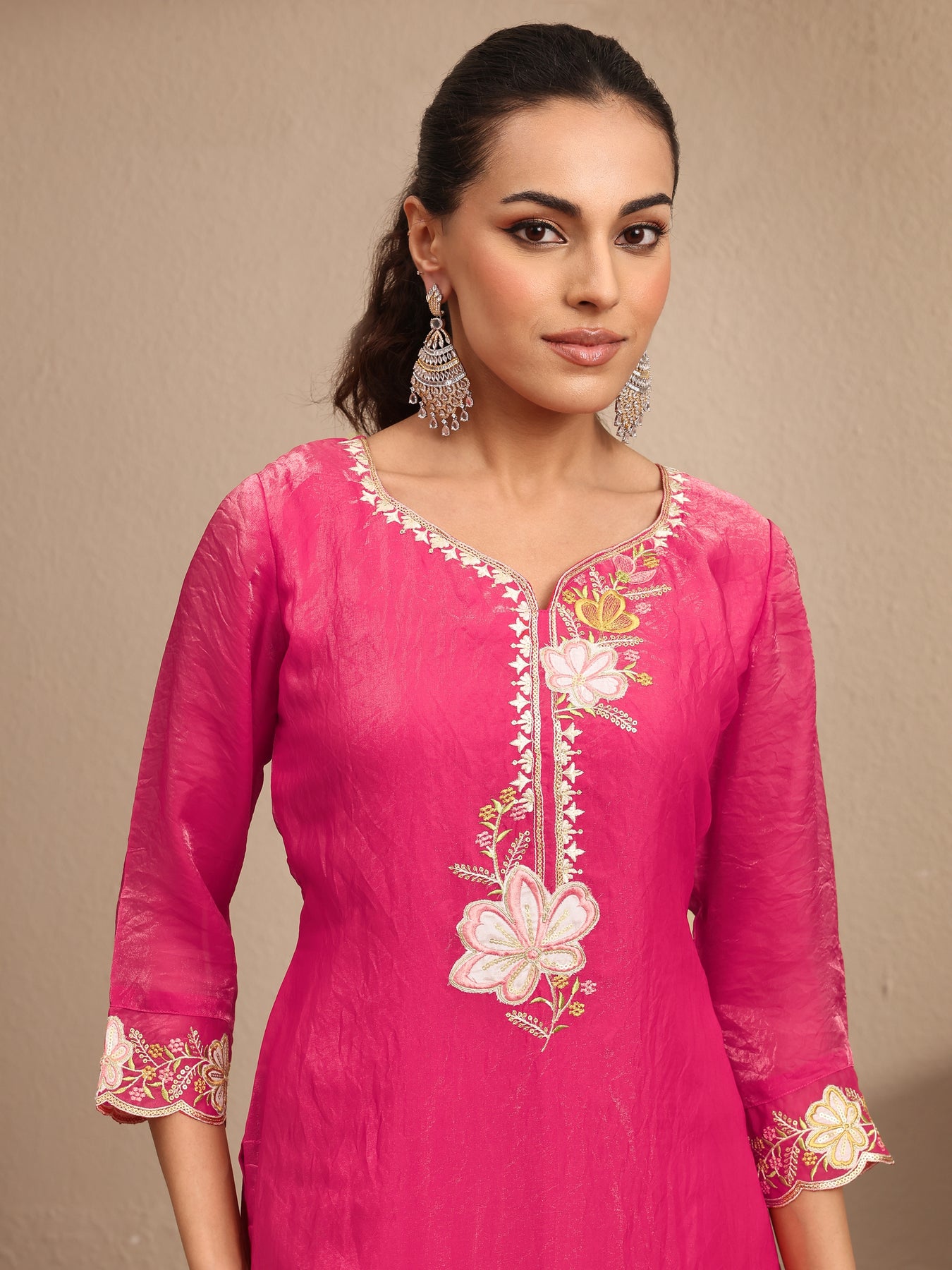 Our 3-piece pink organza kurta set features a straight-fit design with a V-neckline, regular sleeves, and statement yoke. Complemented with straight pants with a partially elasticated waistband and an embroidered dupatta. Adorned with floral embroidered, this style is perfect for festive occasions.