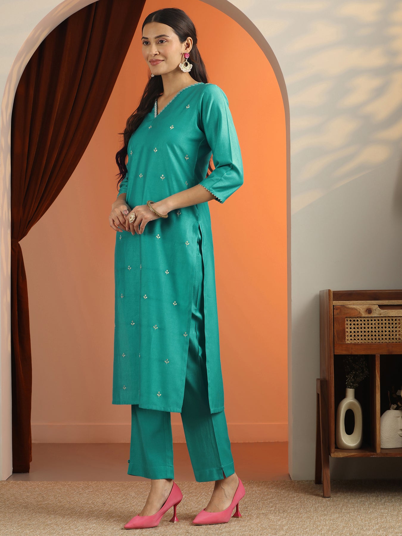 Blue Embroidered Silk Blend Straight Suit Set With Dupatta