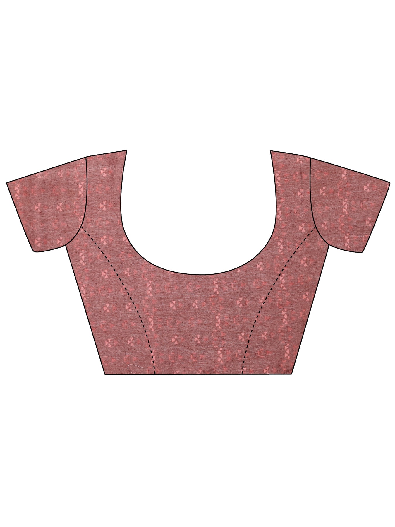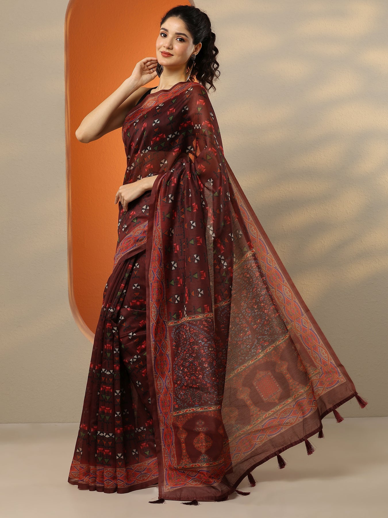 Brown Printed Silk Blend Saree With Unstitched Blouse Piece