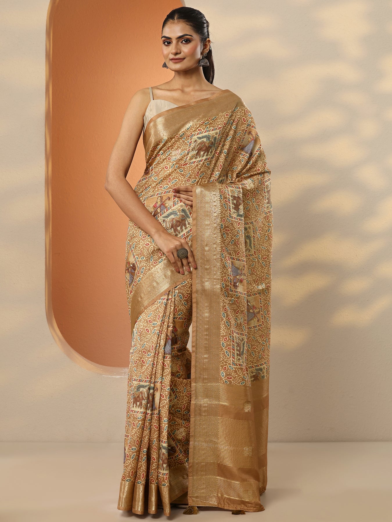 Brown Printed Silk Blend Saree With Unstitched Blouse Piece