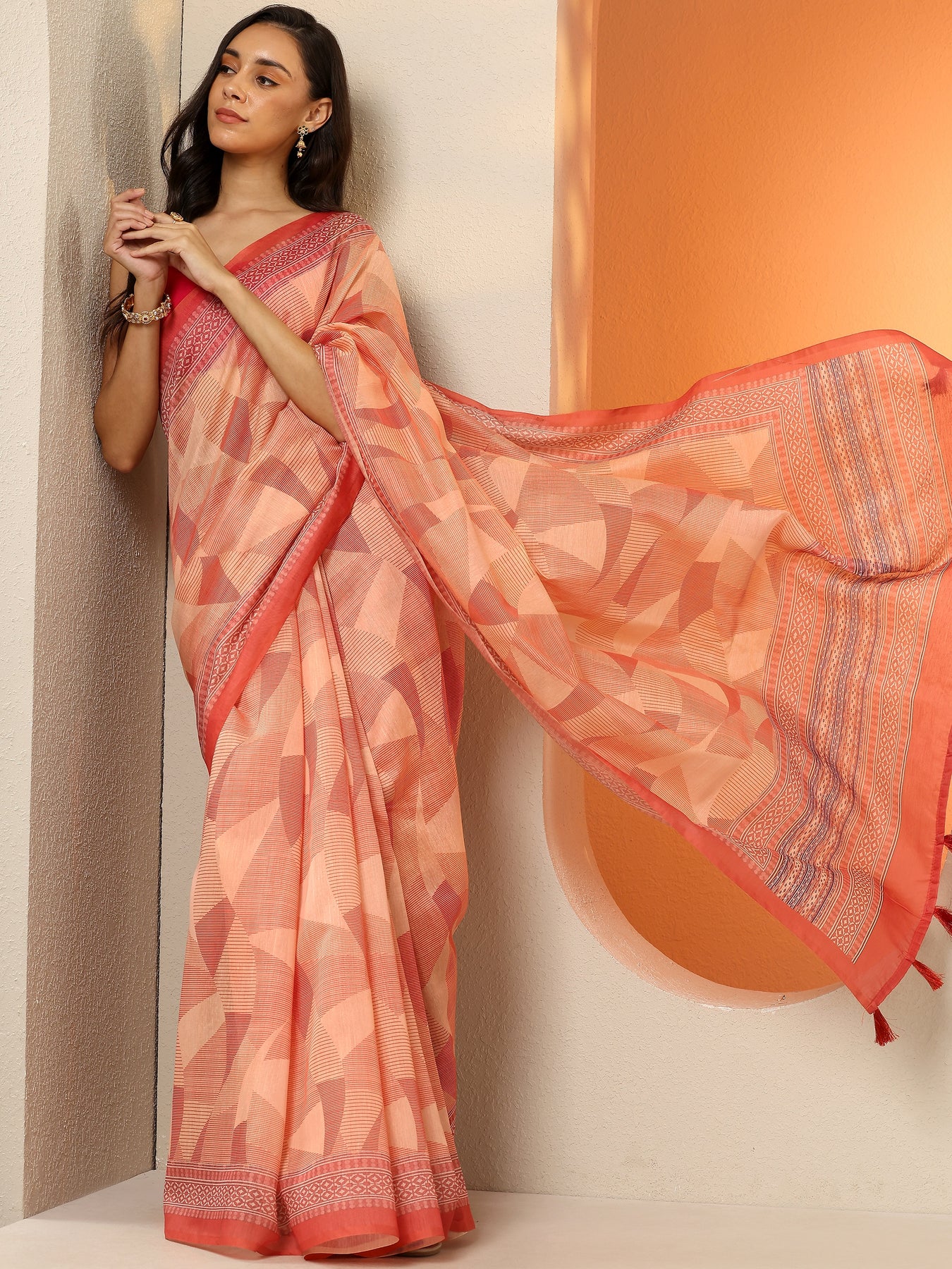 Coral Printed Silk Blend Saree With Unstitched Blouse Piece