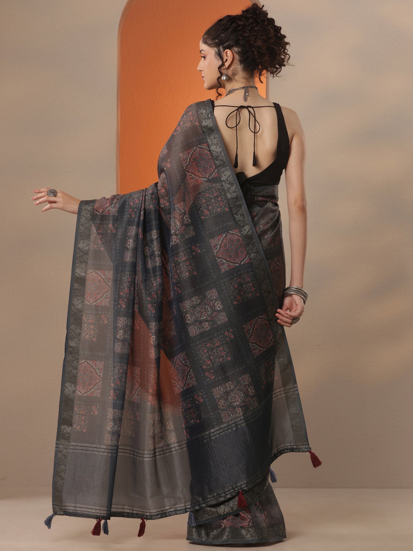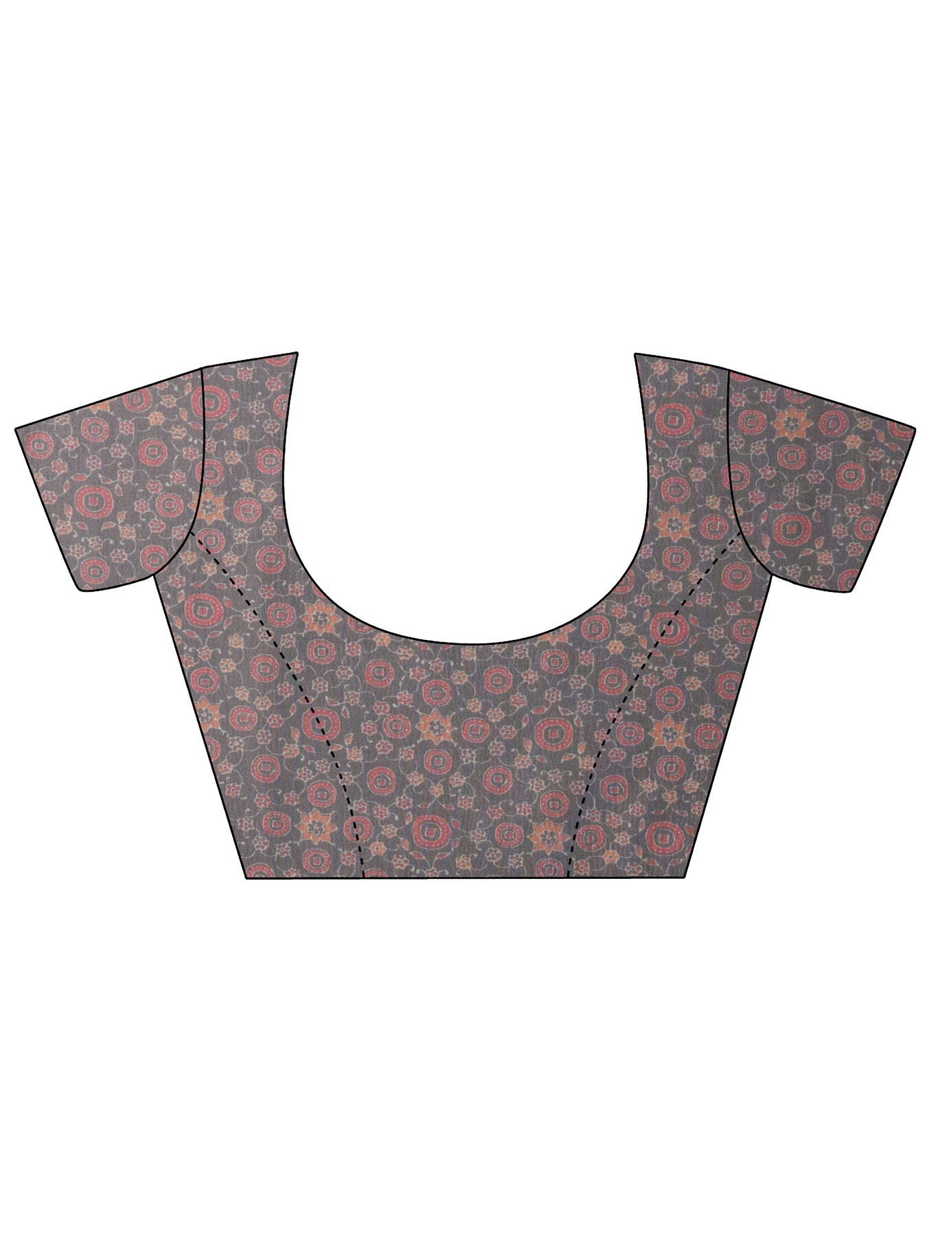 Grey Printed Chinon Saree With Unstitched Blouse Piece