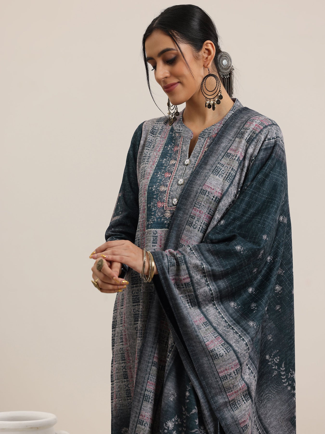 Grey Printed Wool Blend Straight Suit With Dupatta