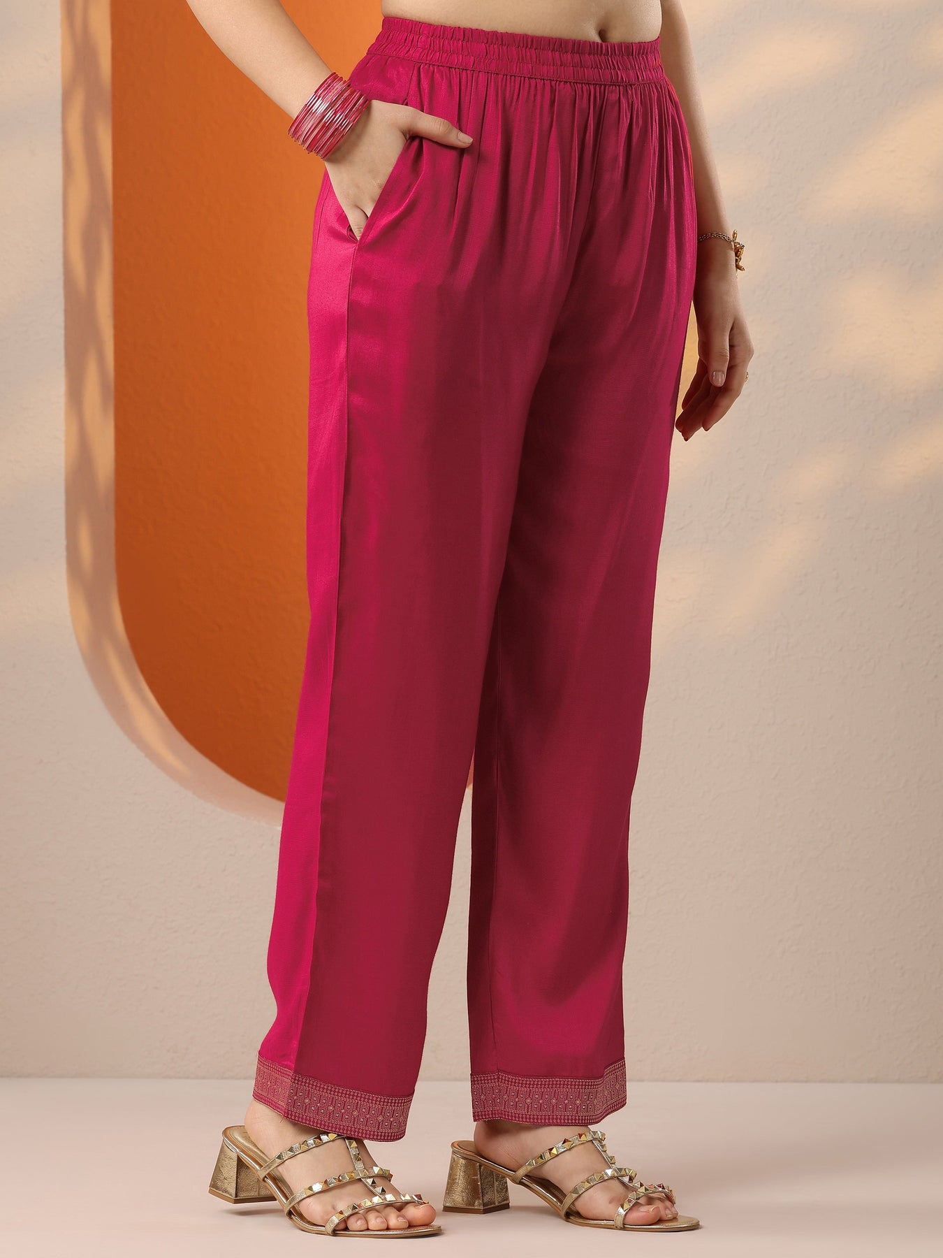 Our 3-piece pink Chinon straight-fit kurta set features a round neckline, regular sleeves, and statement yoke. Complemented with lining and Trouser pants with a partially elasticated waistband and 2 pockets, and an embroidered dupatta. Adorned with ethnic motifs woven design embellishments, this style is perfect for dark festive occasions.