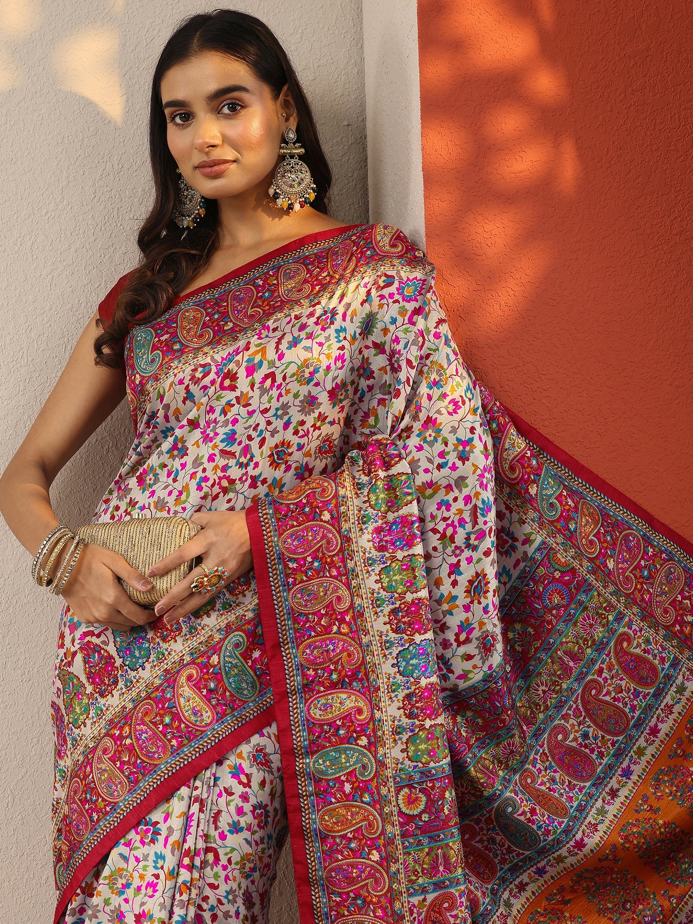 Multi Printed Silk Blend Saree With Unstitched Blouse Piece