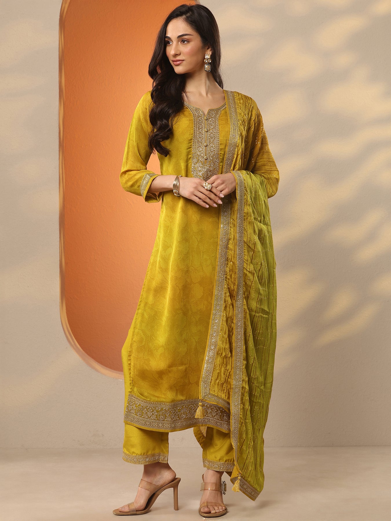 Mustard Embroidered Silk Blend Straight Suit Set With Dupatta