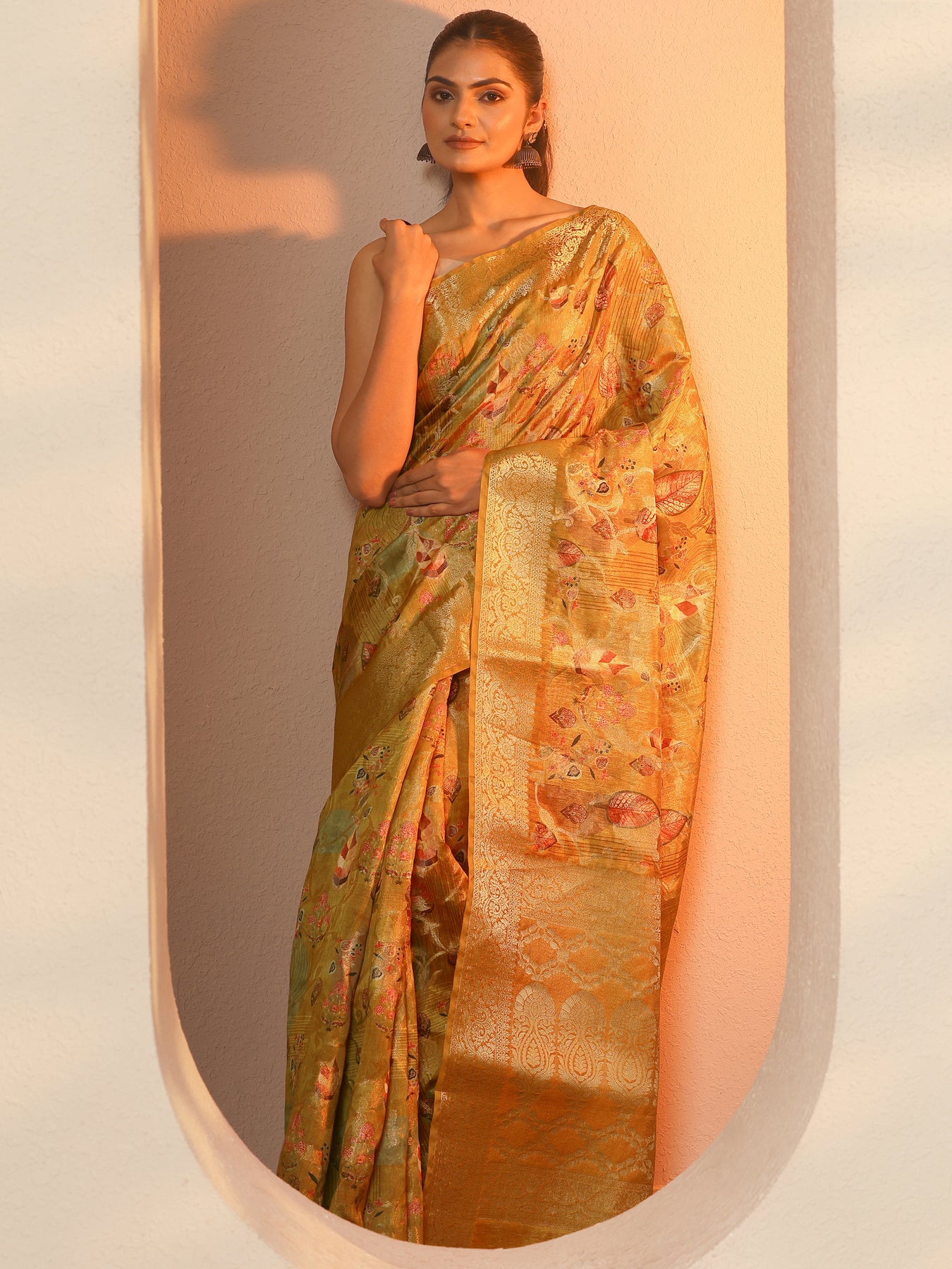 Mustard Printed Silk Blend Saree With Unstitched Blouse Piece