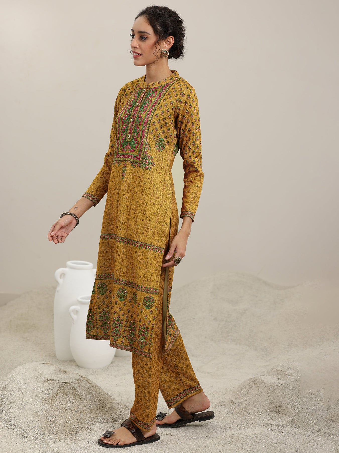 Mustard Printed Wool Blend Straight Suit With Dupatta