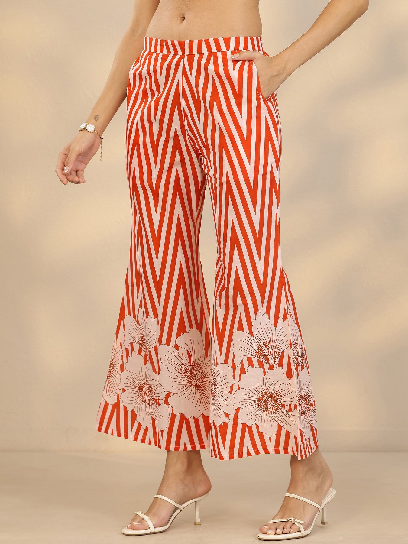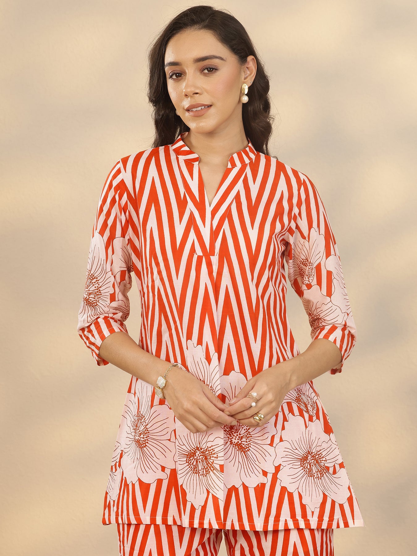 Our 2-piece Orange printed Cotton co-ord set features a Straight-fit Tunic with a Round Neck neckline and Three-quarter sleeves. Complemented with matching Trousers with a Partially Elasticated waistband and 2 pockets. Highlighted with floral and chevron Print, this style is perfect for Work Wear and Casual Wear.