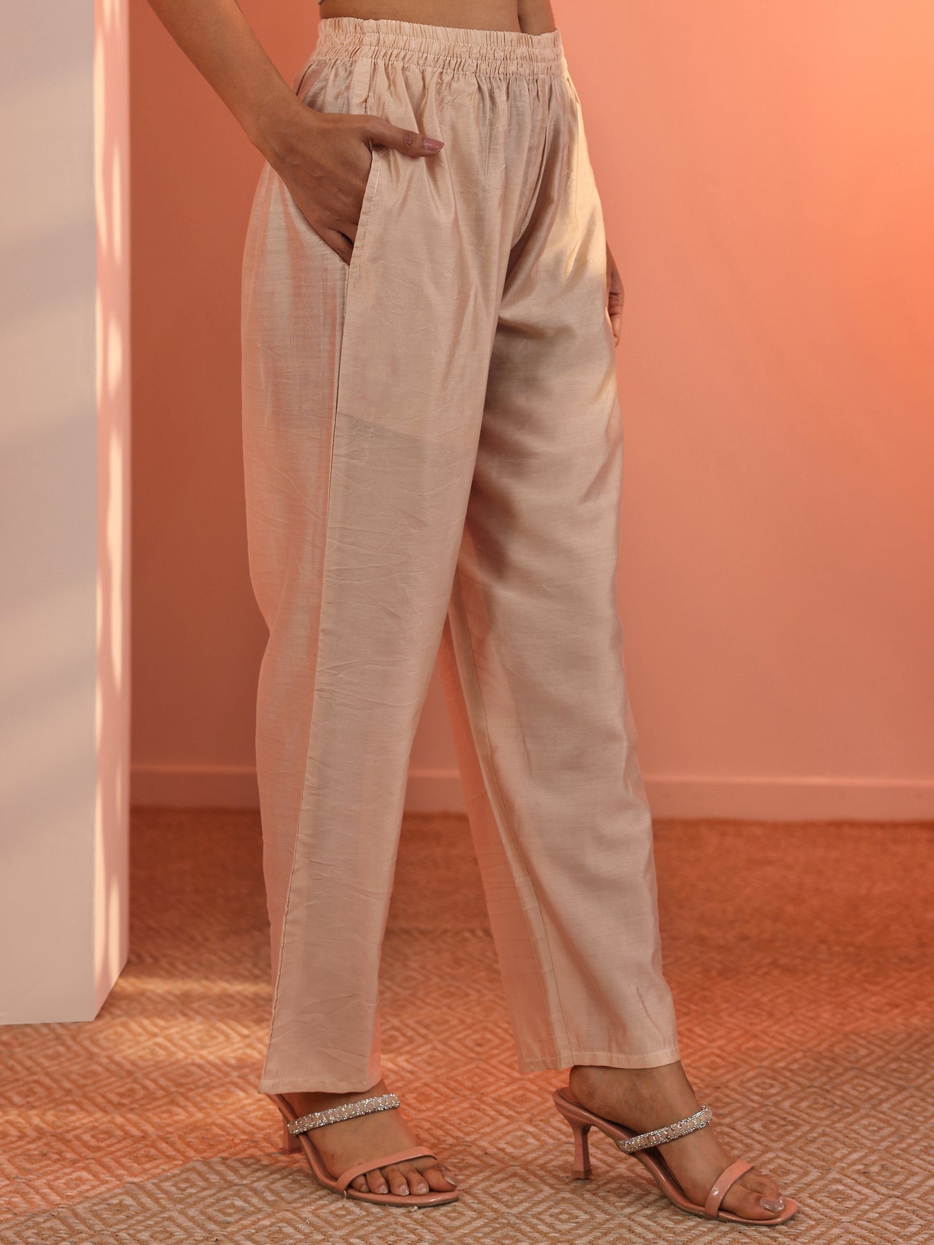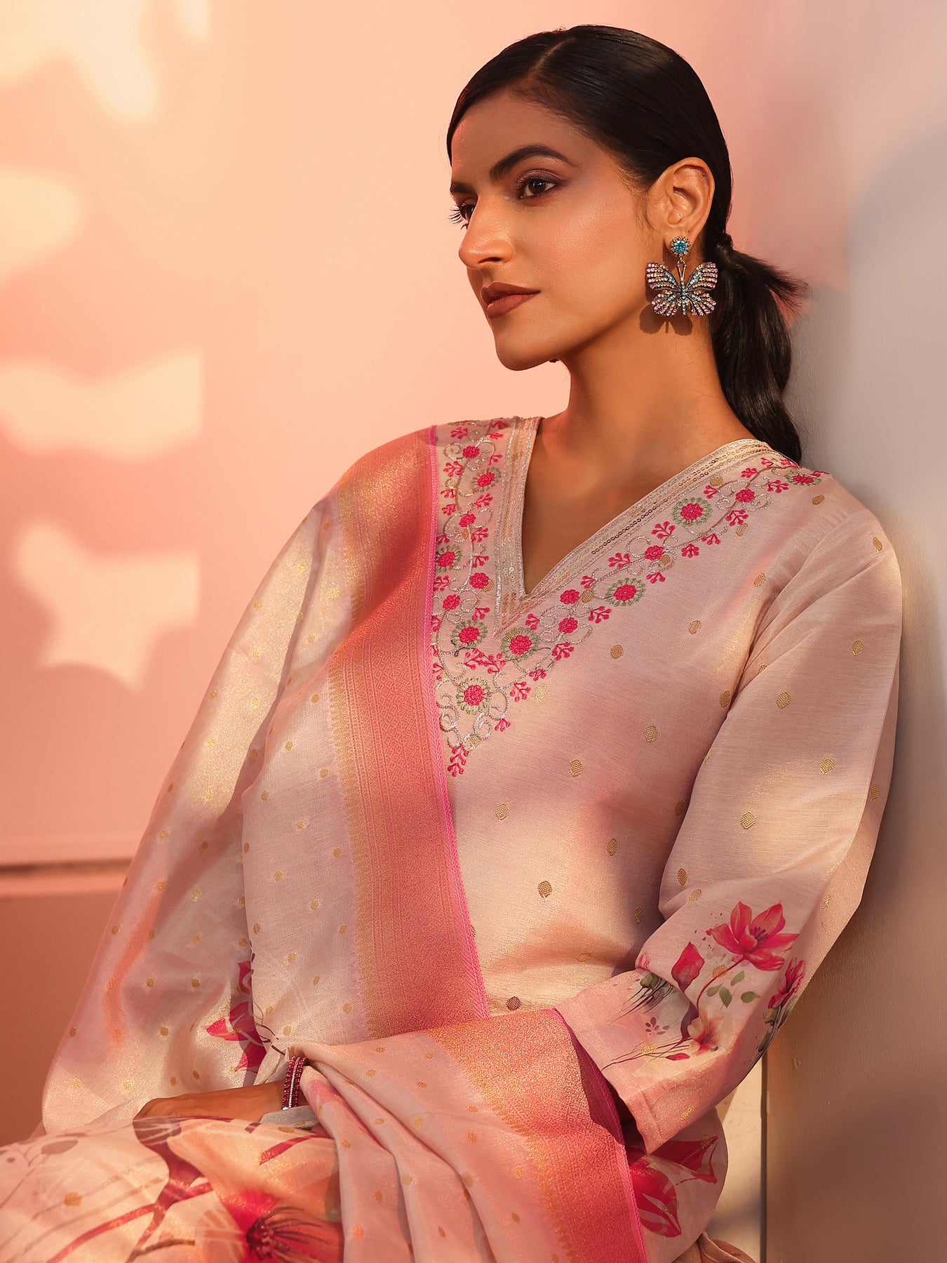 Peach Embellished Silk Blend Straight Suit Set With Dupatta