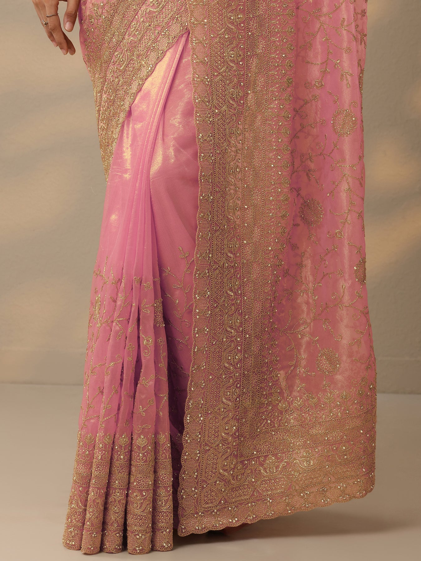 Our Pink Nylon Saree Features Captivating Zari Embroidered Accents. Complemented With An Unstitched Blouse Piece. This Charming Saree Is Perfect For Festive Occasions