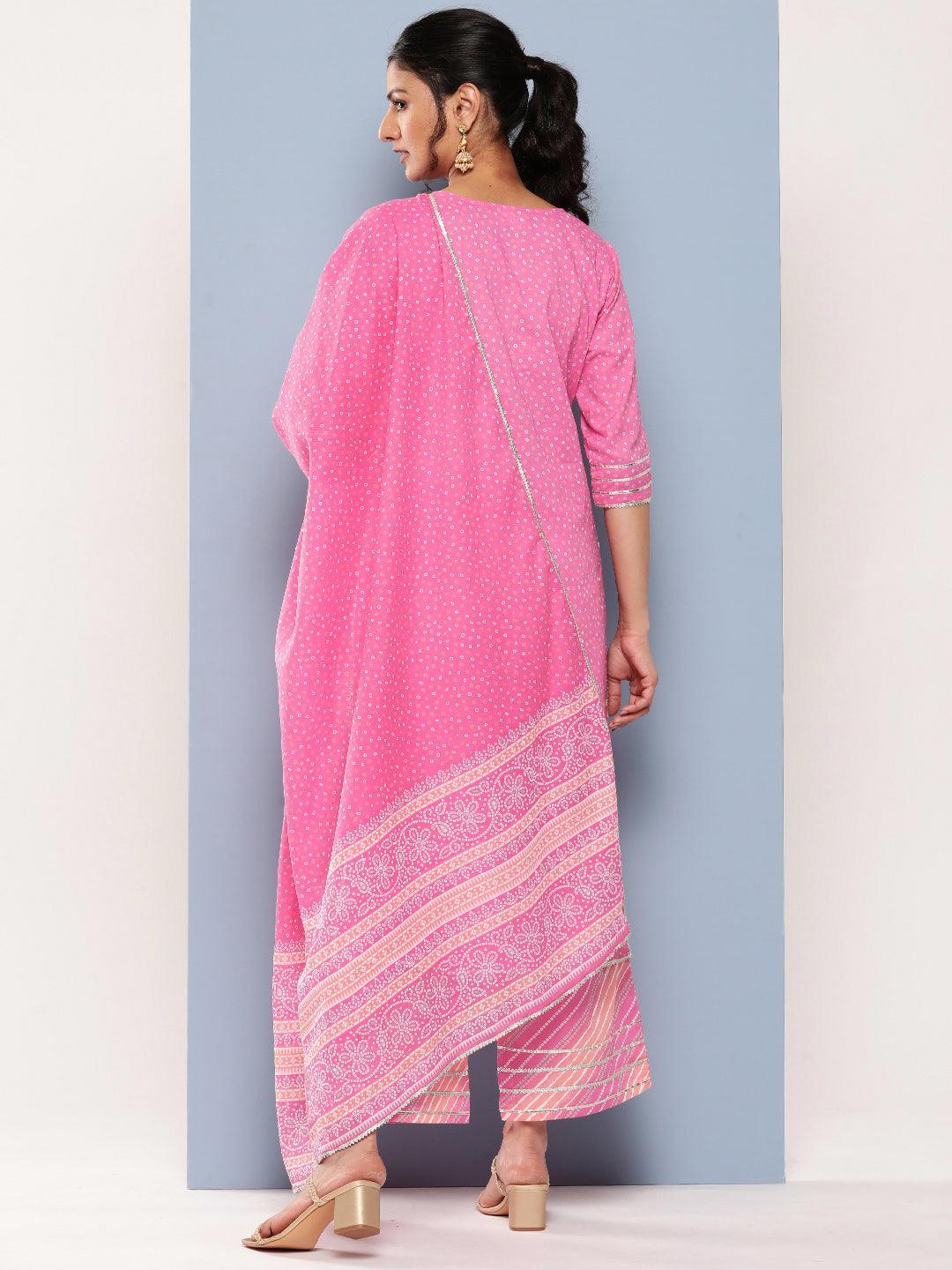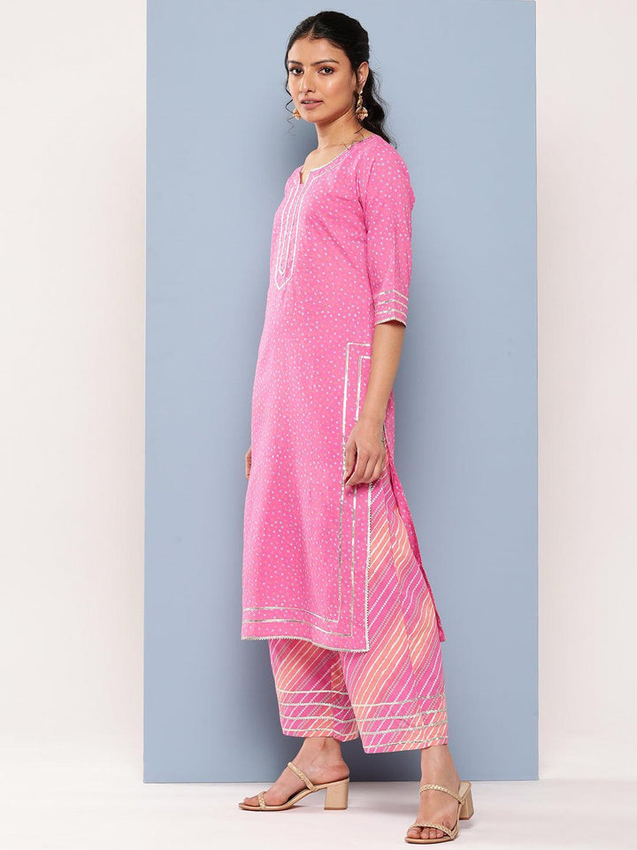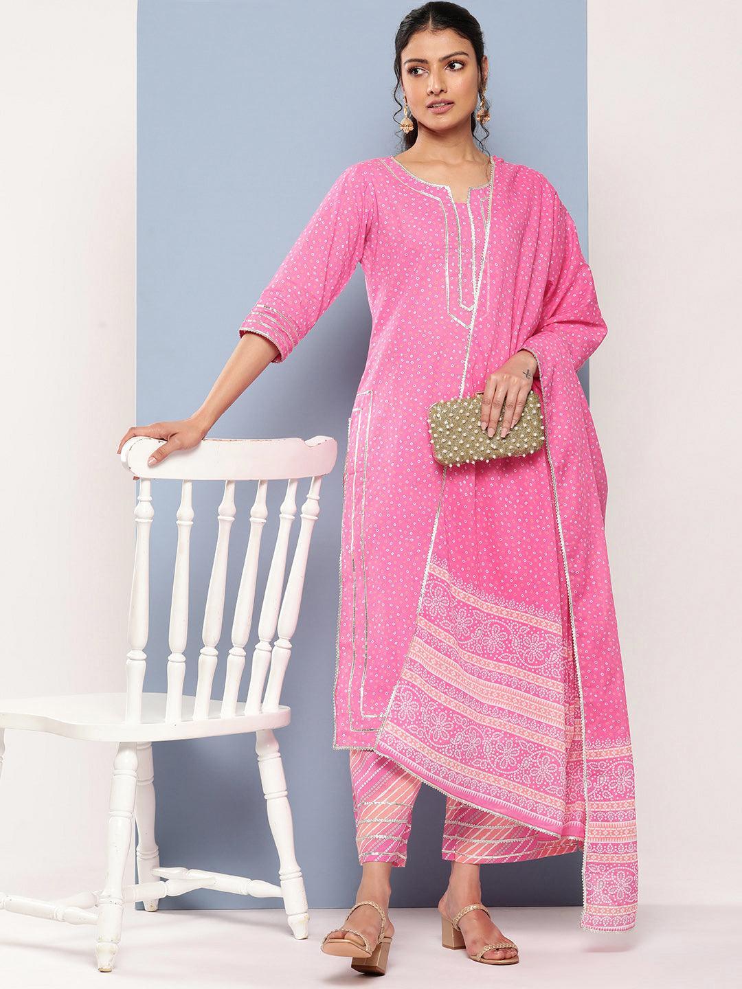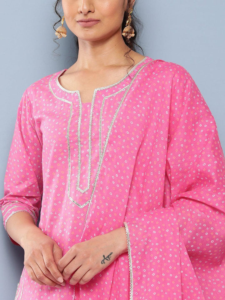 Our 3-piece pink Bandhani inspired print cotton suit set features a straight-fit kurta with a notched neckline and three-quarter sleeves. Complemented with straight palazzo pants with a partially elasticated waistband and roomy pockets, and a dupatta in a matching print. Adorned with delicate Gota Patti accents, this elegant style is perfect for light festivities.