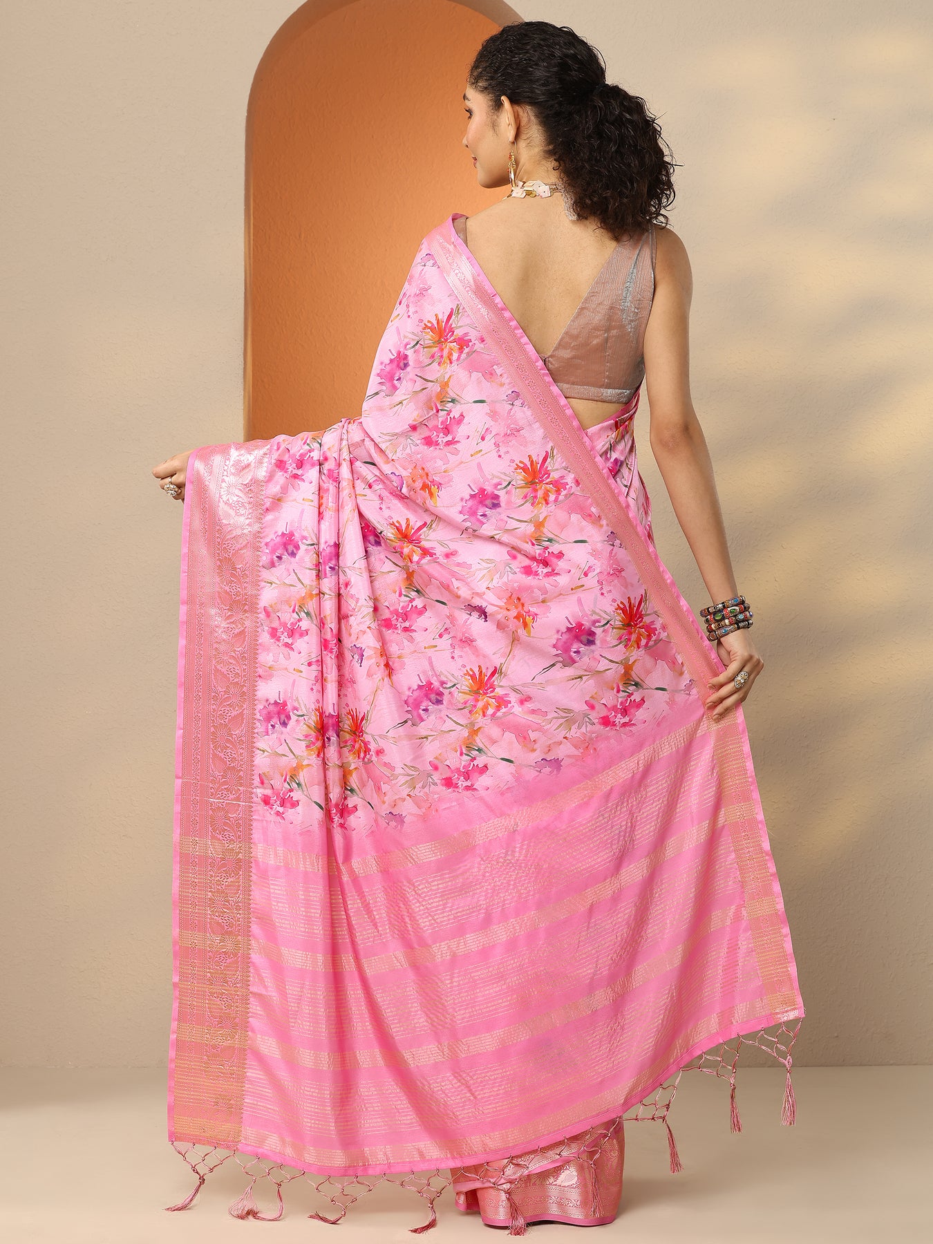 Pink Printed Silk Blend Saree With Unstitched Blouse Piece