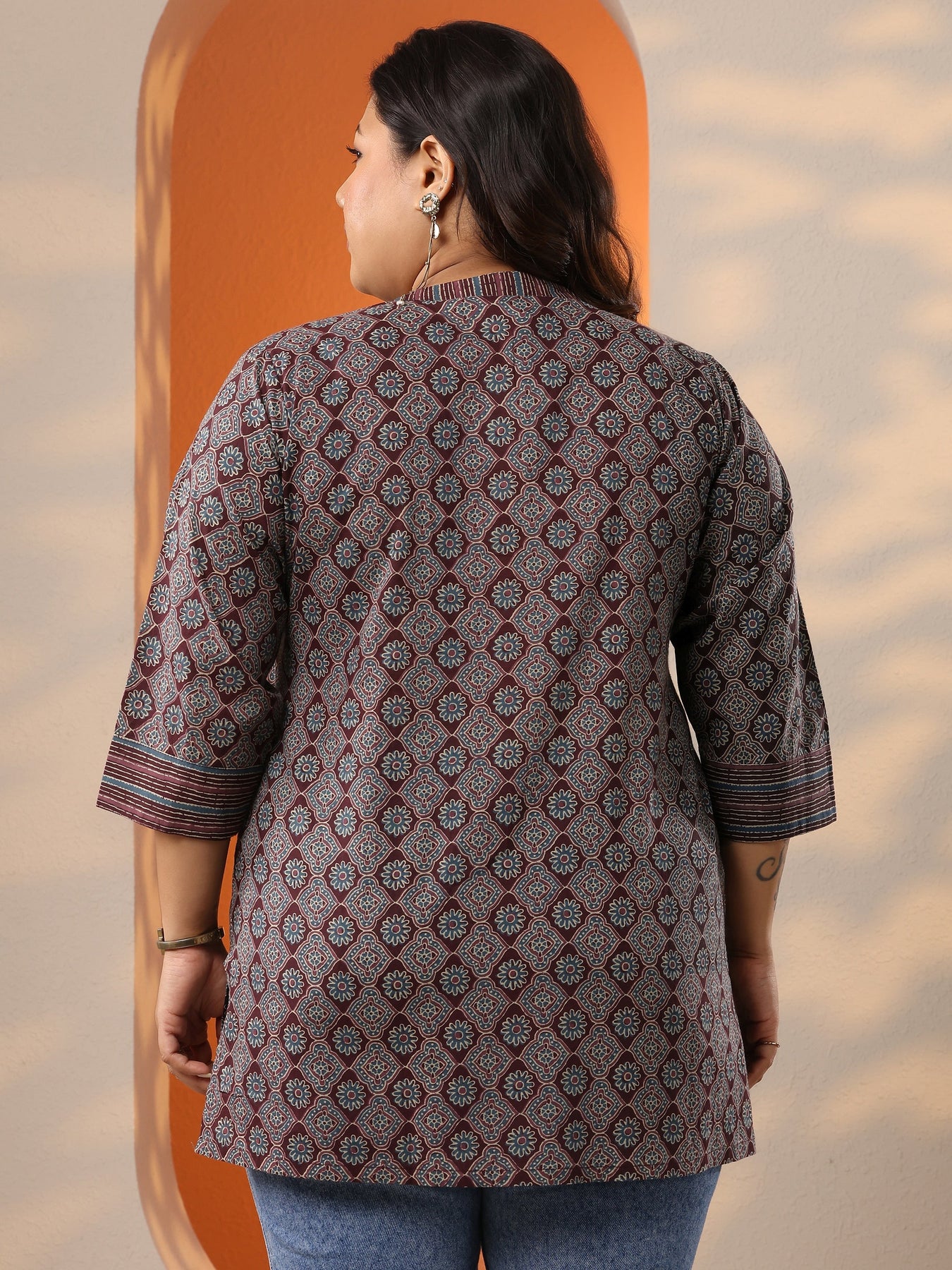 Plus Size Burgundy Printed Cotton Straight Short Kurti