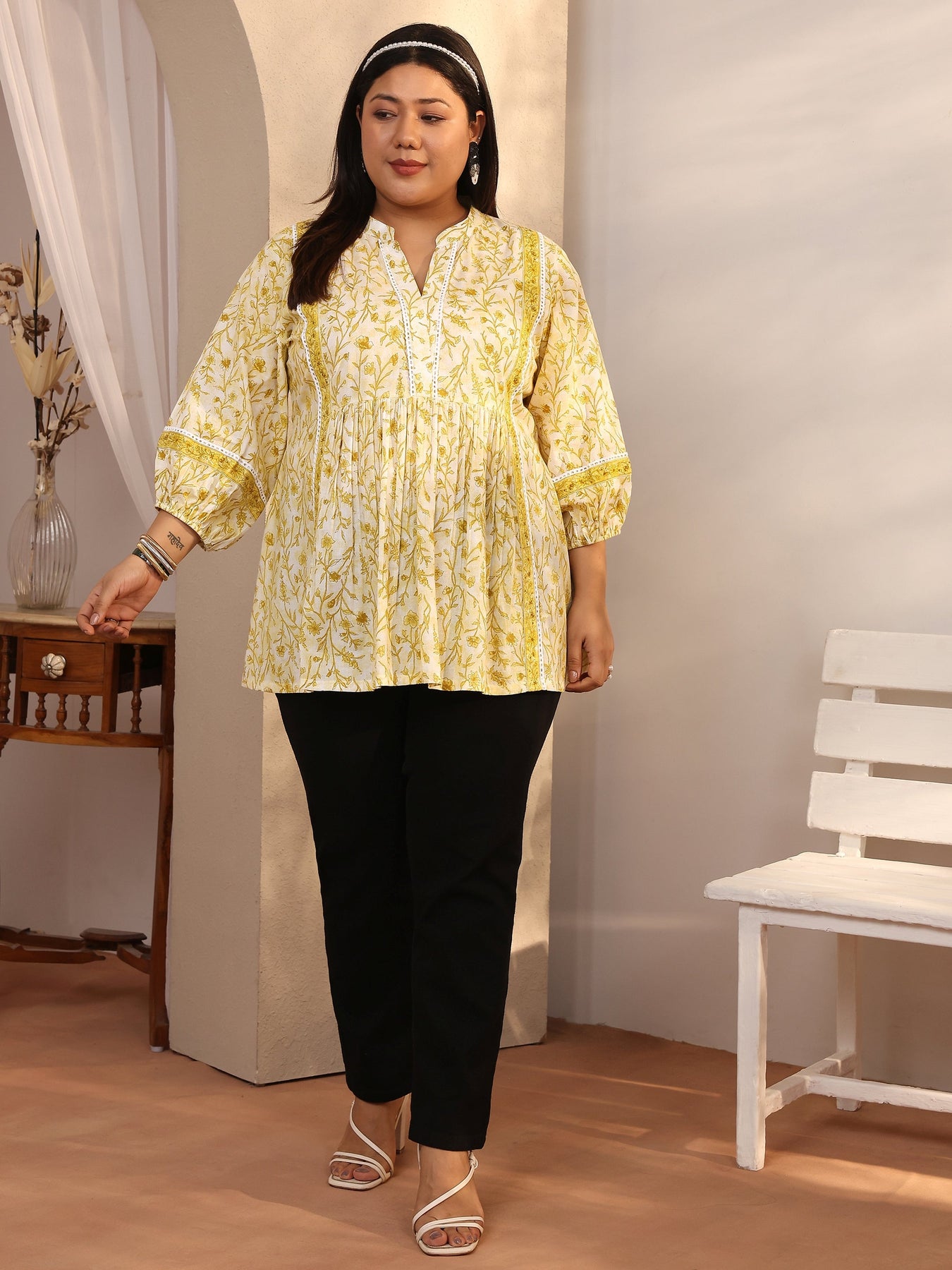 Plus Size Yellow Printed Cotton A-Line Short Kurti