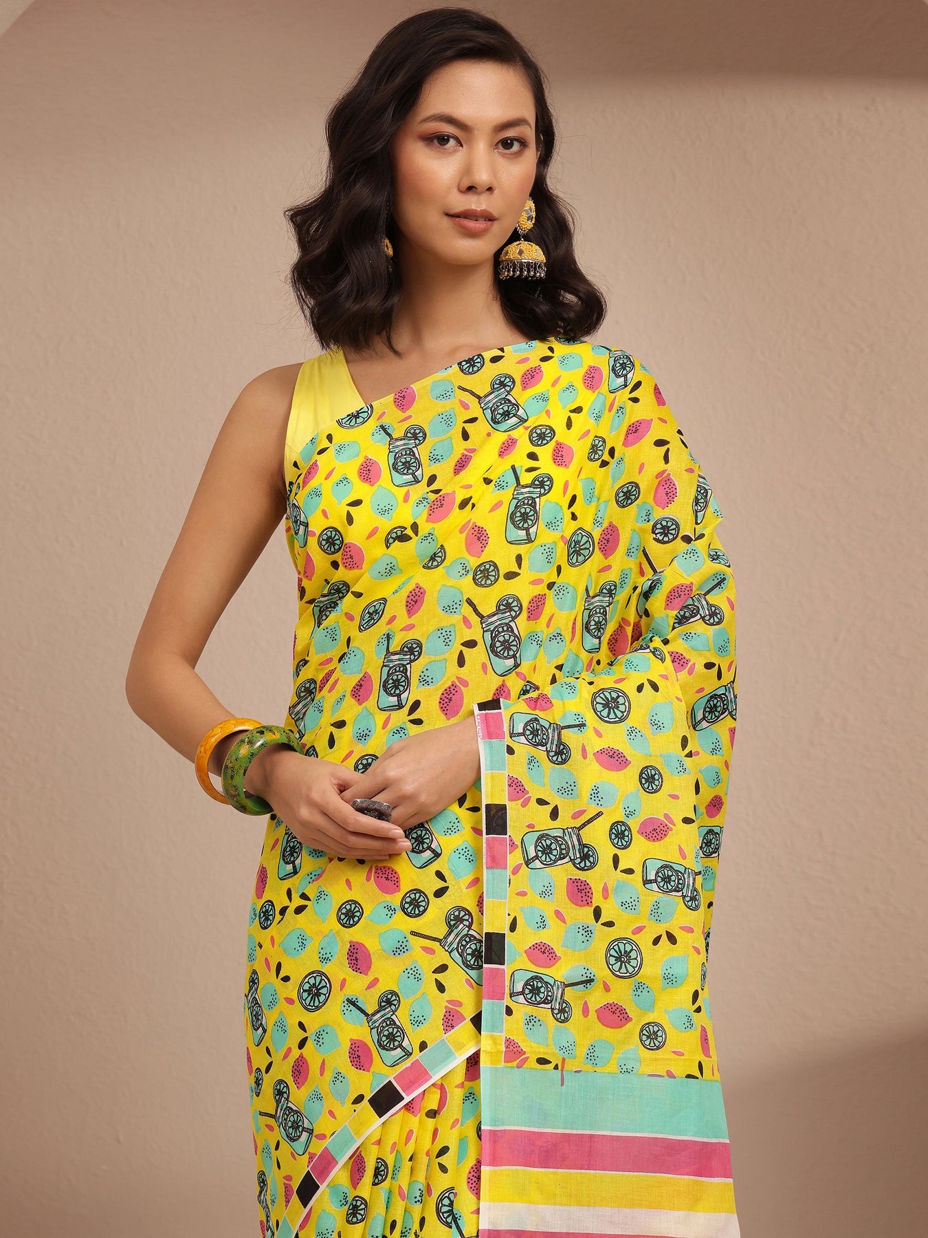 Our yellow printed cotton saree features captivating top print. Complemented with an unstitched Blouse Piece. This charming saree is perfect for festive occasions