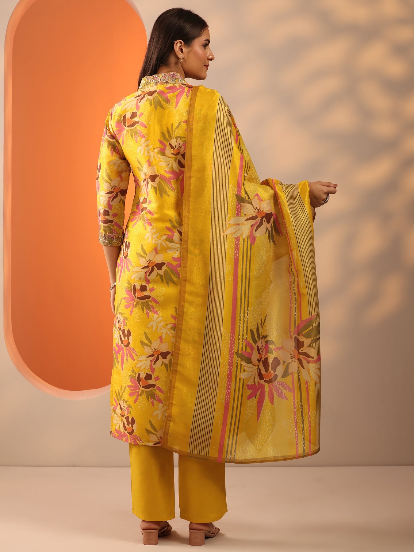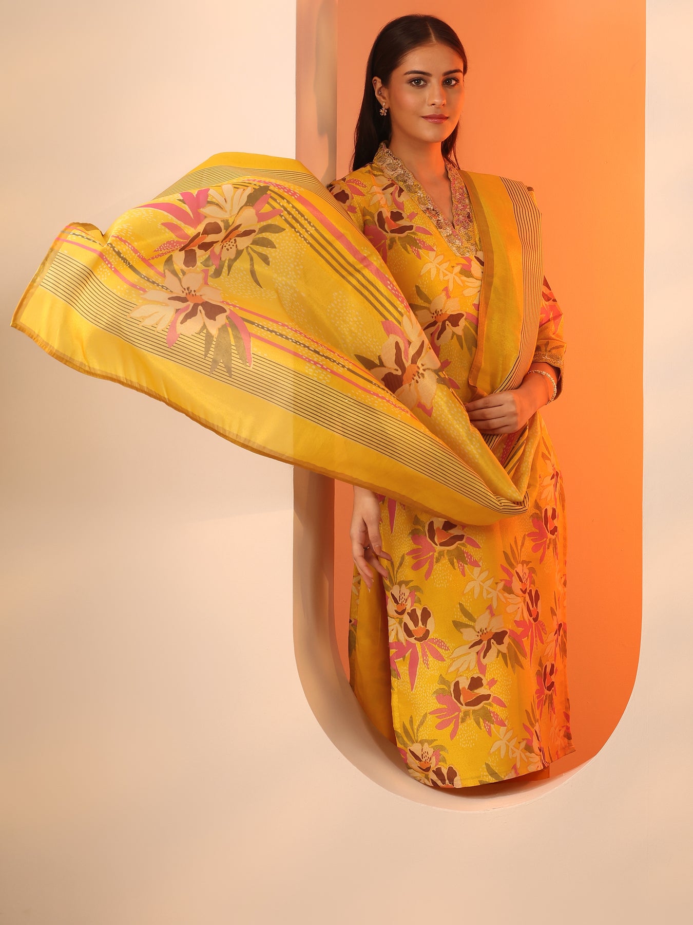 Our 3-piece yellow silk blend straight-fit kurta set features a V-neckline, regular sleeves, and statement yoke. Complemented with straight pants with a partially elasticated waistband and 2 pockets, and a printed dupatta. Adorned with floral prints, this style is perfect for festive occasions.
