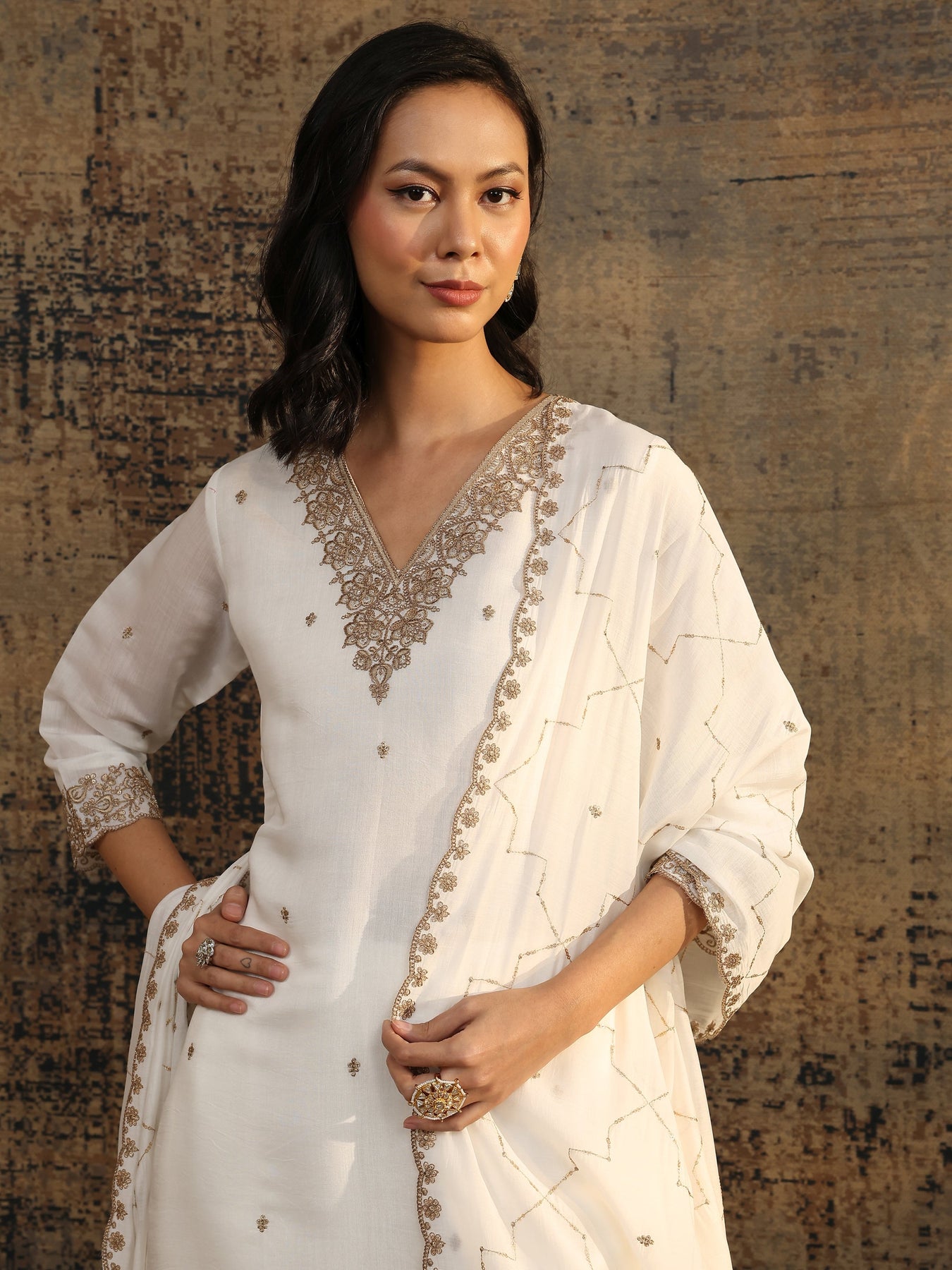 White Embroidered Chanderi Cotton Straight Suit Set With Dupatta