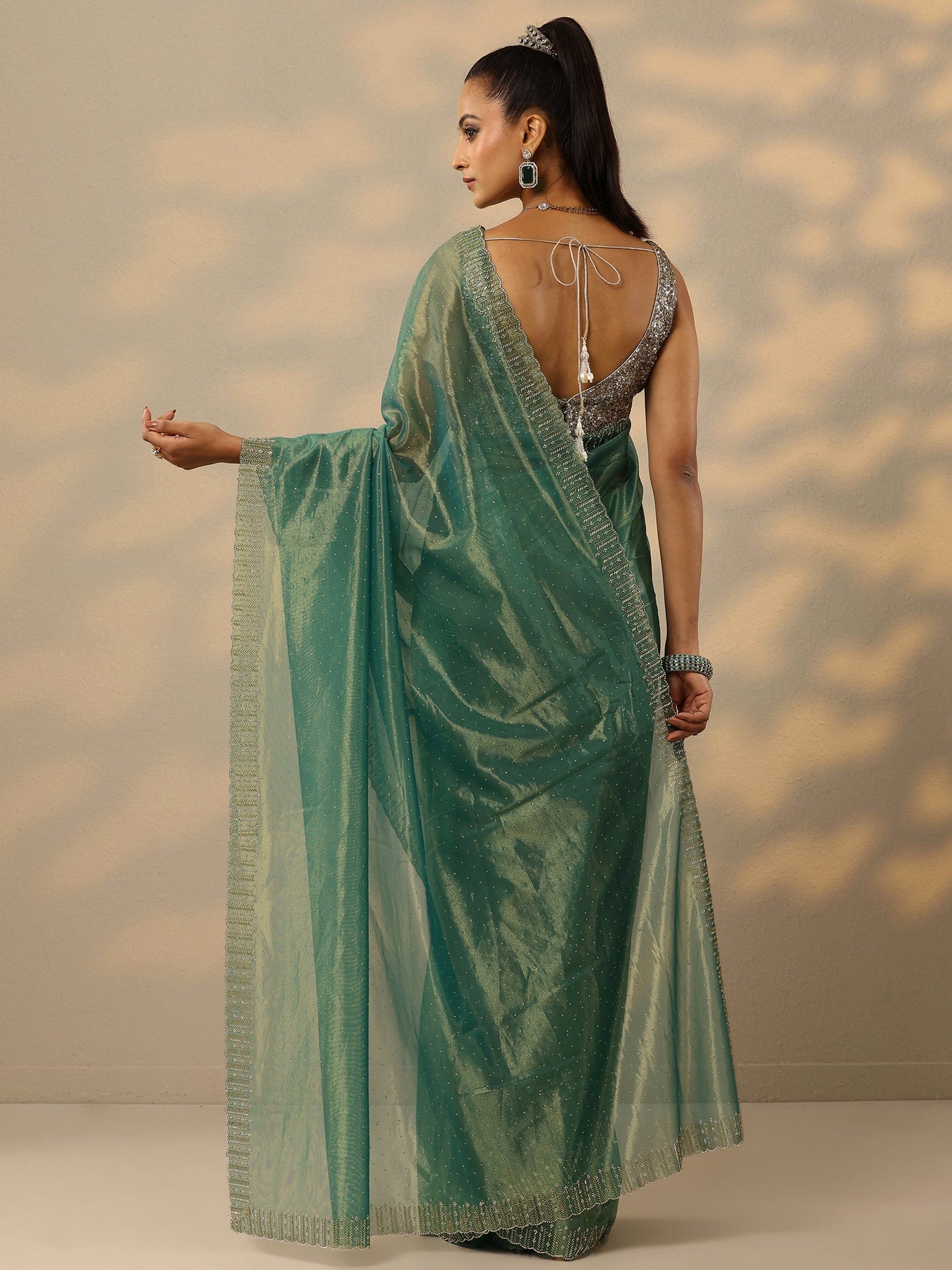 Green Embellished Nylon Saree With Unstitched Blouse Piece