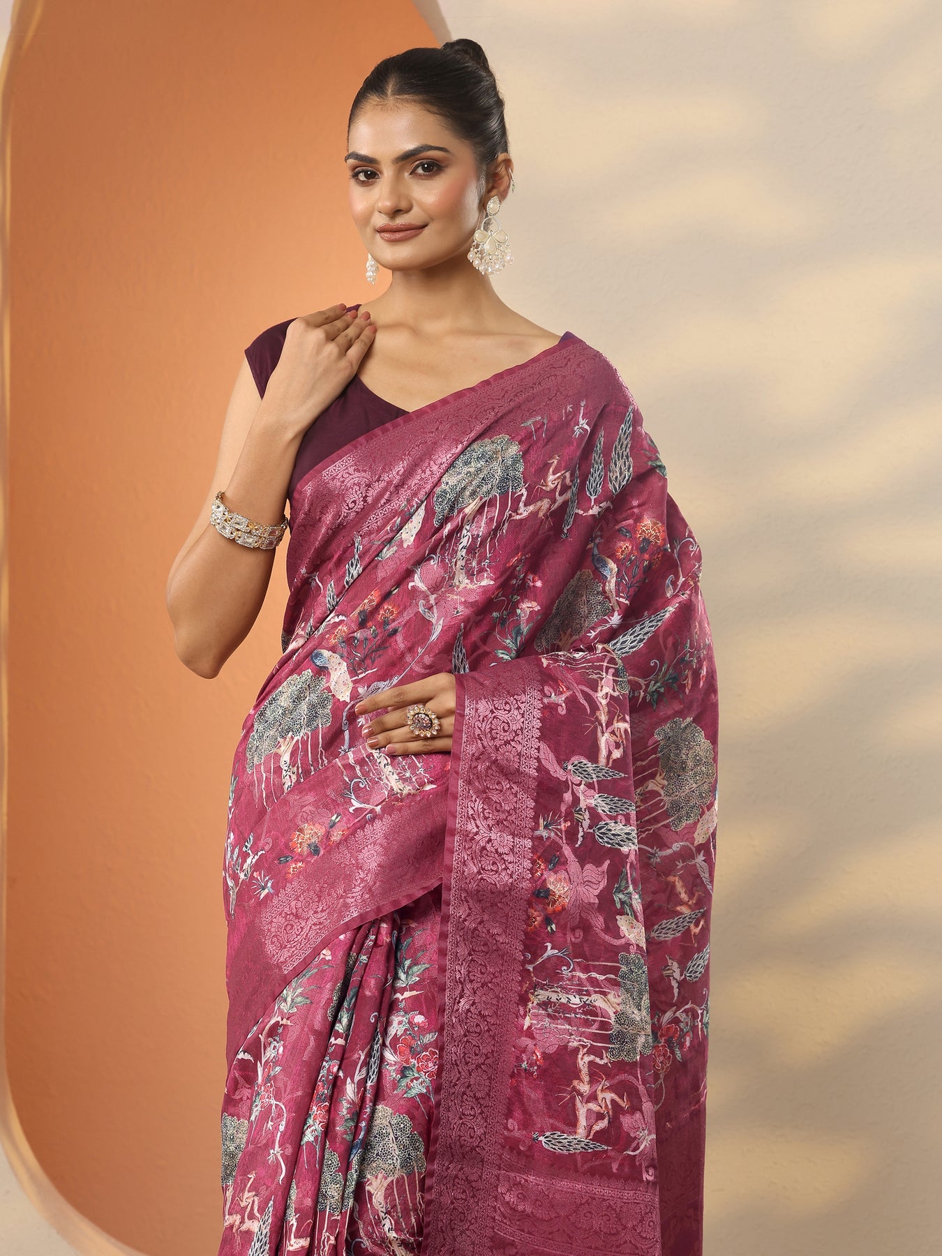 Maroon Printed Silk Blend Saree With Unstitched Blouse Piece